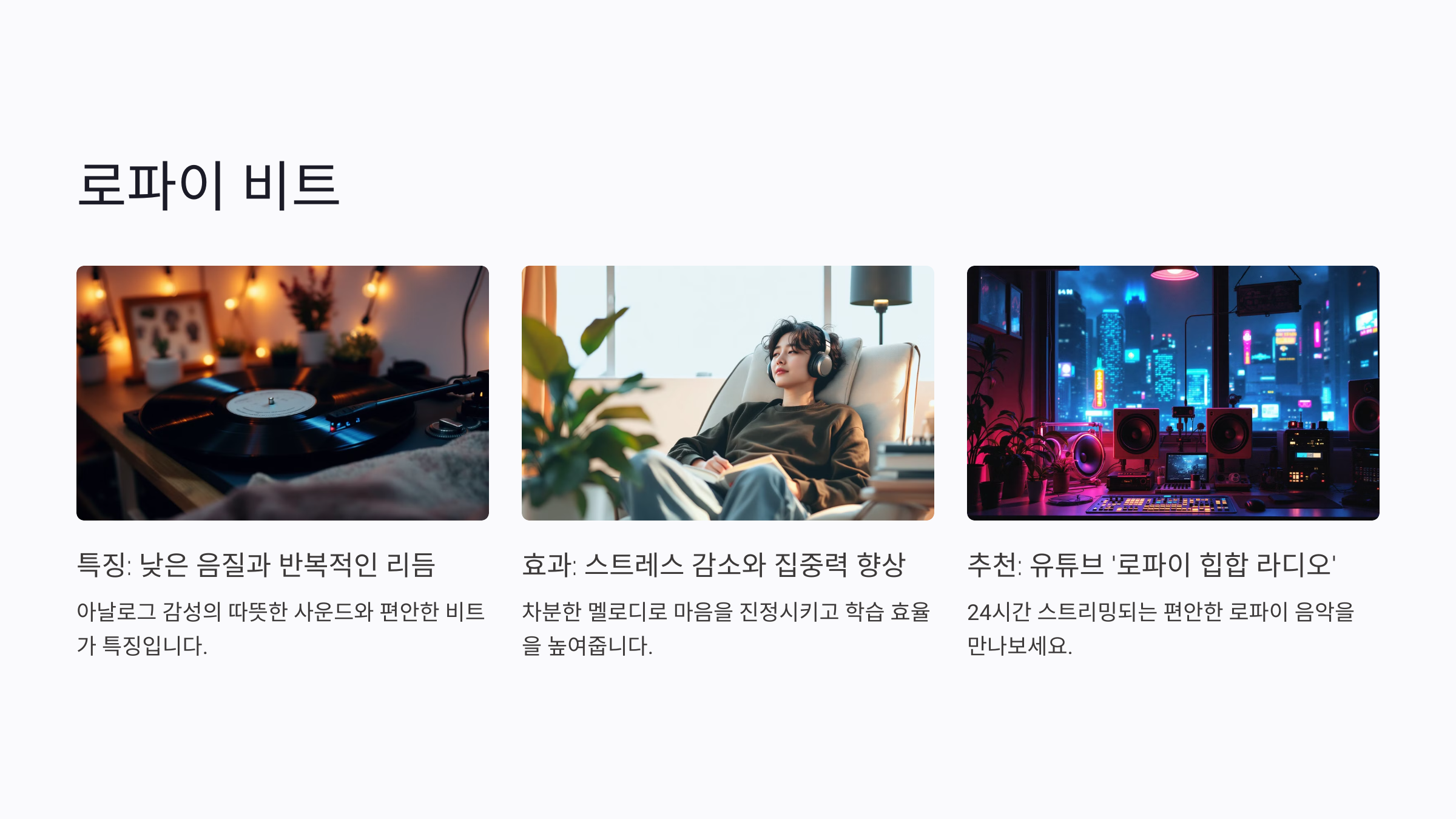 로파이 비트는 낮은 음질과 반복적인 리듬이 특징인 음악이에요. 특히 유튜브의 '로파이 힙합 라디오'는 전 세계적으로 많은 사람들이 사랑하는 콘텐츠 중 하나랍니다. 이런 음악은 스트레스를 줄이고 집중력을 높이는 데도 탁월한 효과가 있어요.