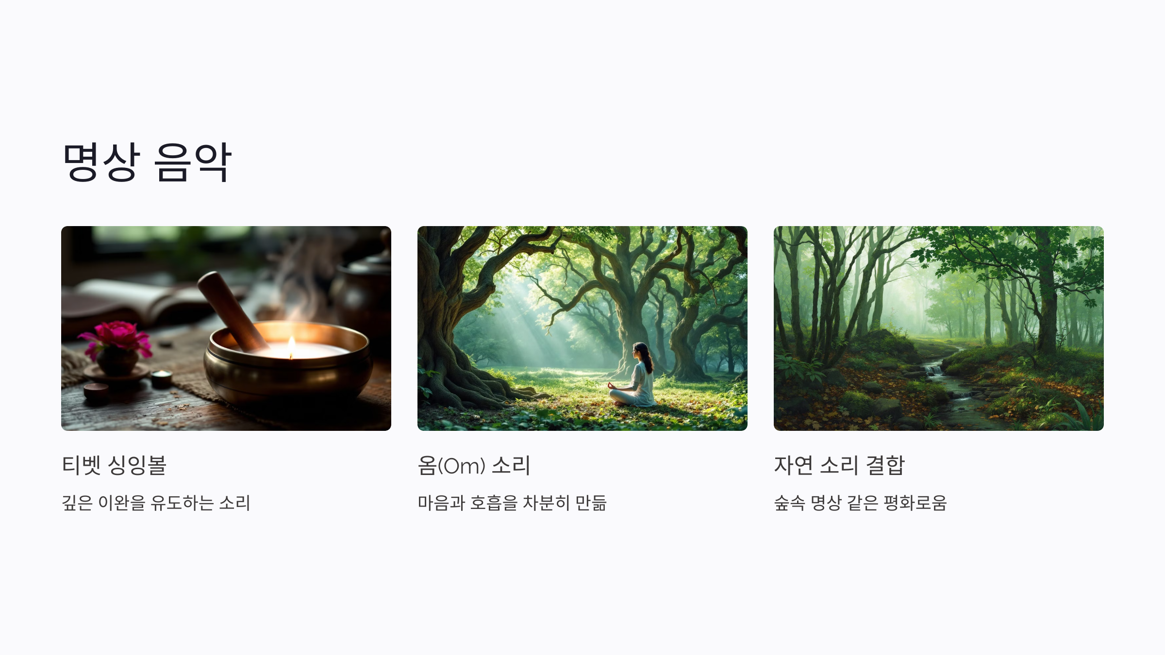 명상 음악은 우리의 마음과 호흡을 차분히 만들어주는 데 최적화된 음악이에요. 특히 티벳 싱잉볼 소리나 옴(Om) 소리가 포함된 명상 음악은 몸과 마음을 깊이 이완시키는 데 탁월하답니다.