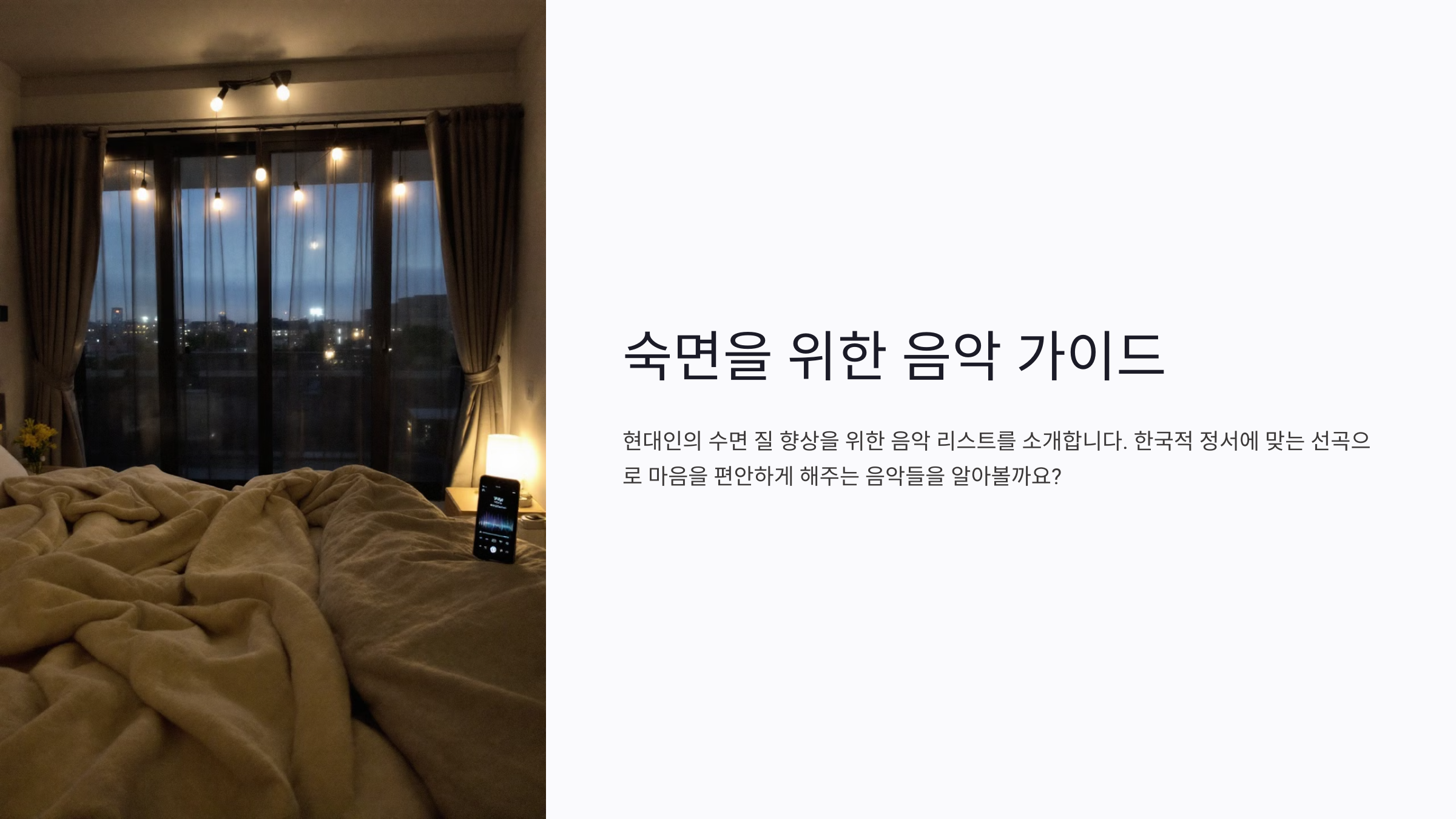 현대인들은 스트레스와 불규칙한 생활로 인해 수면의 질이 많이 떨어지는 경우가 많아요. 그래서 숙면을 돕는 음악은 정말 소중한 도구가 될 수 있죠. 이번에는 제가 생각했을 때, 가장 효과적이라고 여겨지는 수면 음악 리스트를 소개해 볼게요. 모든 곡들은 마음을 편안하게 해주는 특징이 있고, 한국적인 정서에도 잘 맞는 선곡들로 골랐답니다.