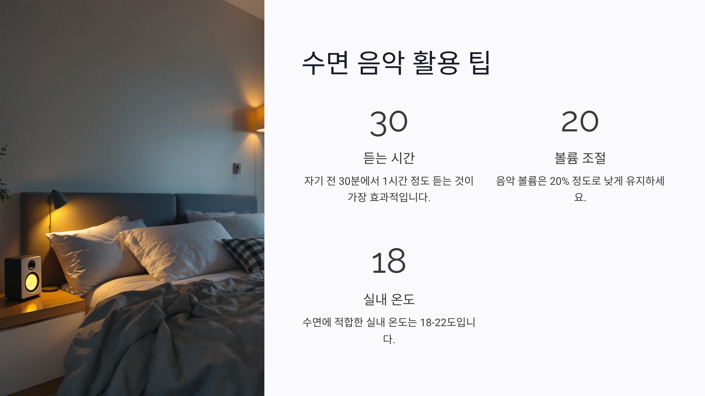 A1. 대부분의 사람들에게 수면 음악은 긍정적인 영향을 줘요. 하지만 개인의 취향에 따라 다를 수 있으니 다양한 음악을 시도해 보세요.