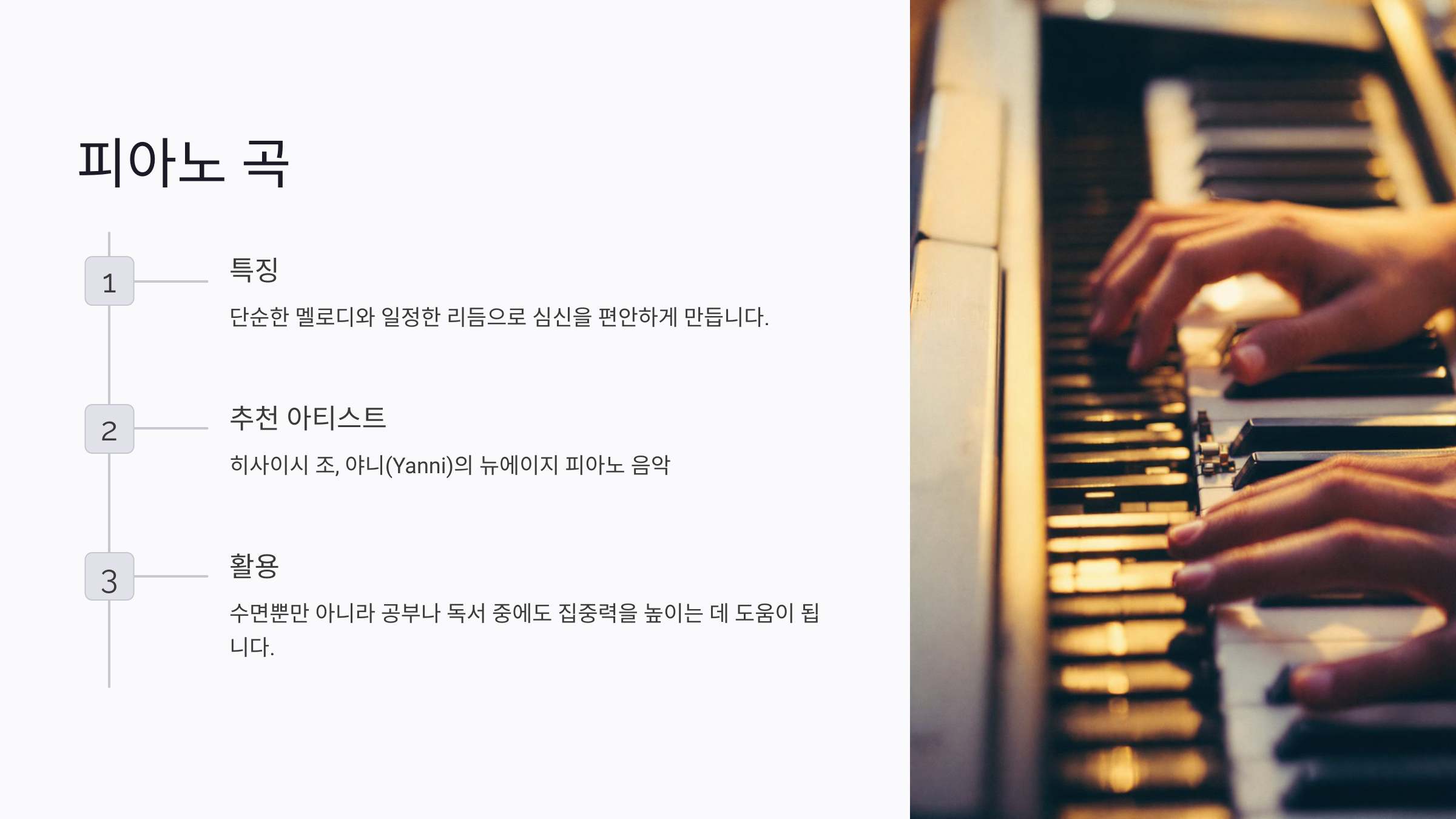 이 장르는 공부나 독서 중에도 활용하기 좋은데, 반복되는 멜로디 덕분에 집중력을 방해하지 않아요. 이러한 특성 덕분에 피아노 곡은 수면 음악으로서뿐 아니라 일상 속에서도 사랑받고 있답니다.