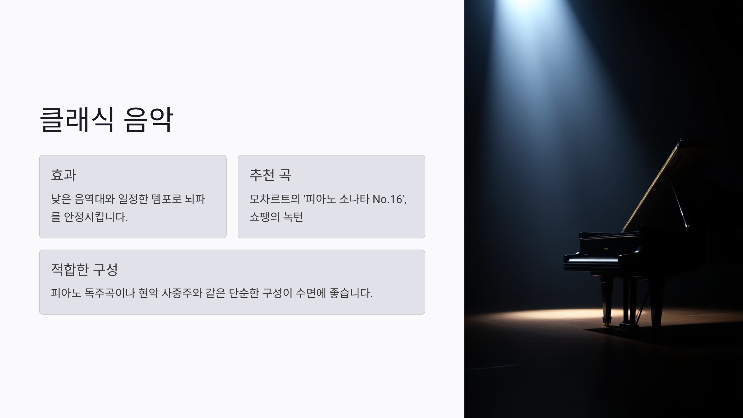 클래식 음악은 낮은 음역대와 일정한 템포를 가지고 있어 뇌파를 안정시켜주는 효과가 있어요. 특히 교향곡보다는 피아노 독주곡이나 현악 사중주처럼 단순한 구성을 가진 곡들이 수면에 더 적합하답니다. 쇼팽의 녹턴은 특히 수면을 위한 음악으로 많이 추천되곤 하죠.