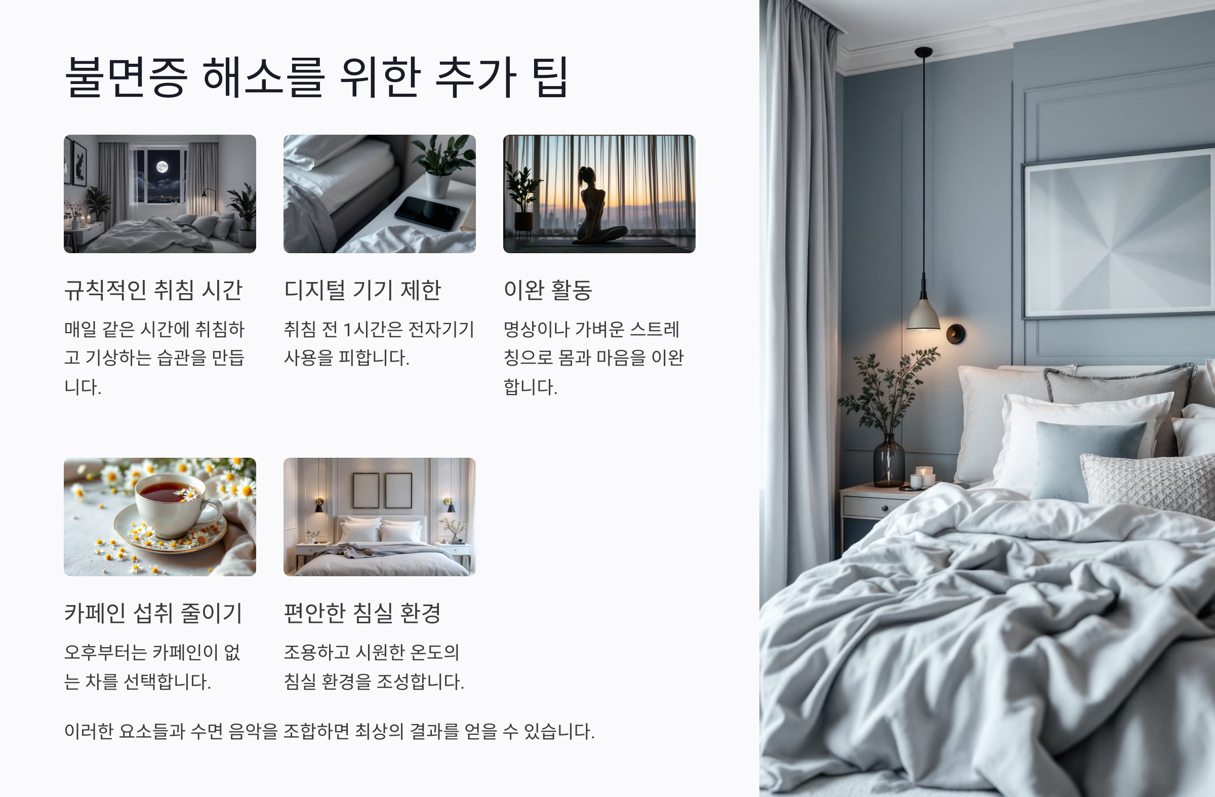 불면증을 완화하기 위해 수면 음악 외에도 몇 가지 추가적인 팁을 활용할 수 있어요. 첫째, 규칙적인 취침 시간을 유지하는 것이 중요해요. 매일 같은 시간에 잠드는 습관은 신체 리듬을 안정적으로 만들어 줘요.