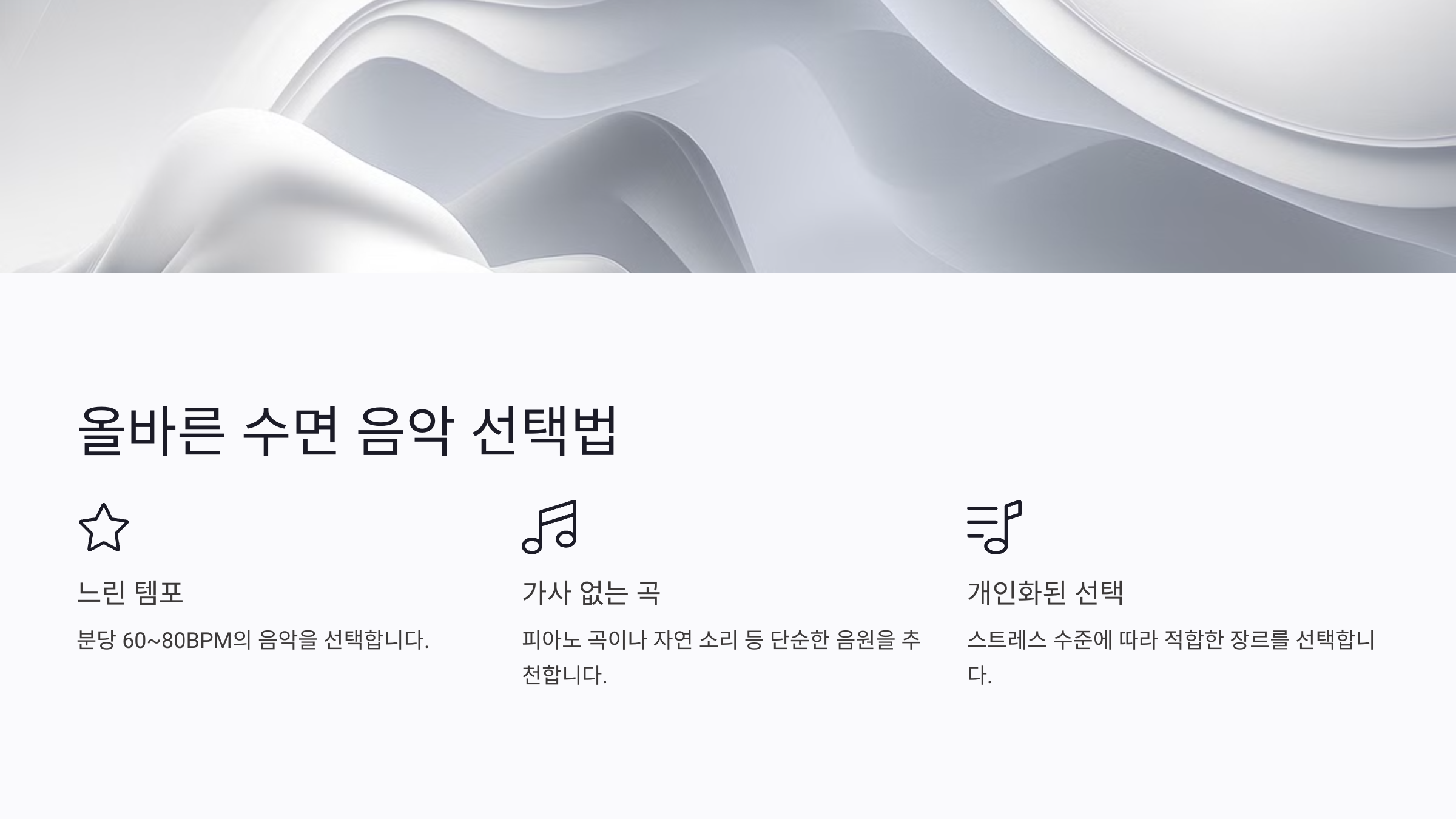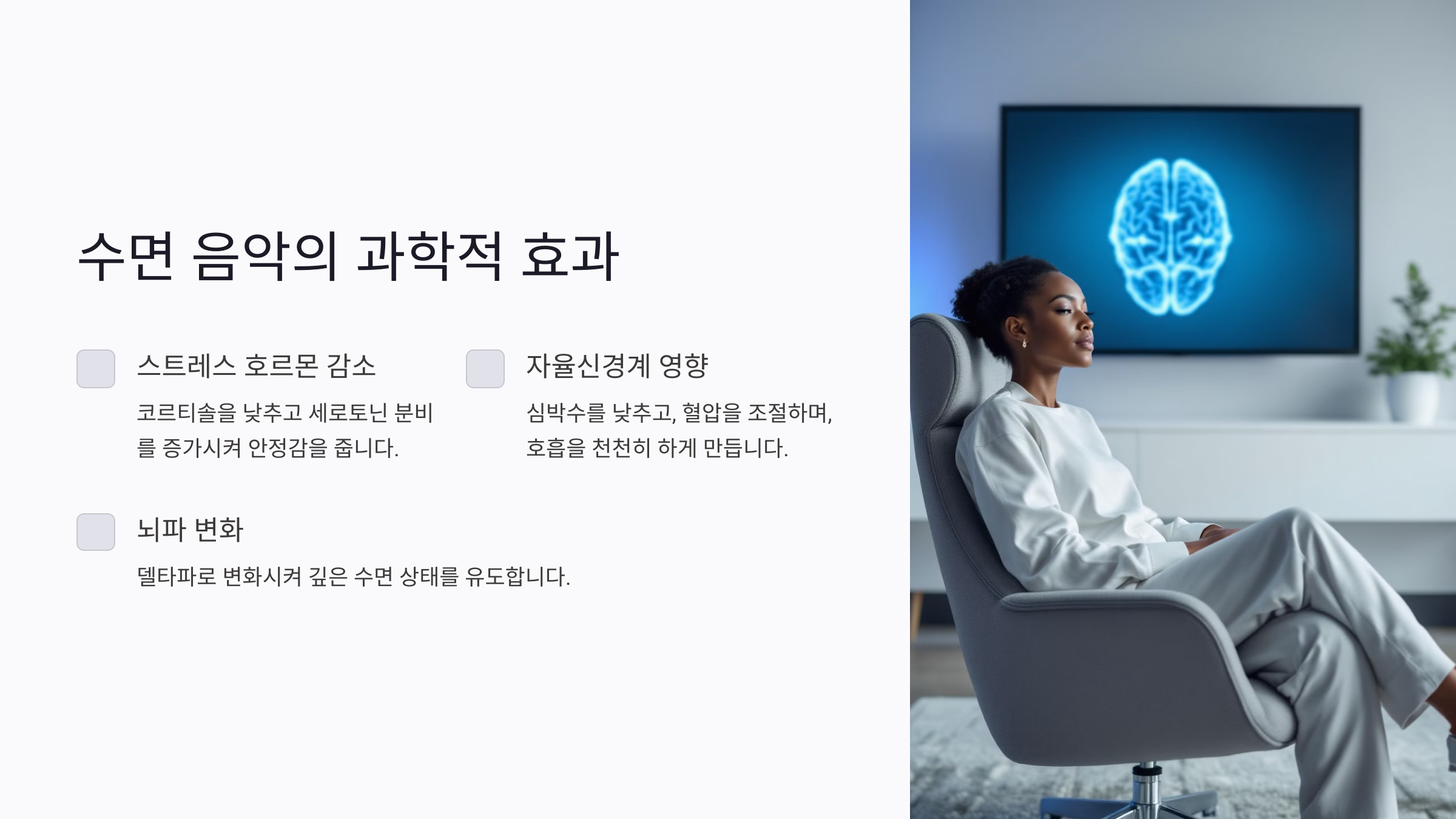 수면 음악은 신체와 뇌에 과학적으로 긍정적인 영향을 미쳐요. 여러 연구에서 음악이 스트레스 호르몬인 코르티솔(cortisol)을 낮추고, 세로토닌(serotonin) 분비를 증가시켜 안정감을 준다는 것이 입증되었어요. 이런 효과는 숙면에 필요한 조건인 뇌파의 안정화를 유도해 준답니다.