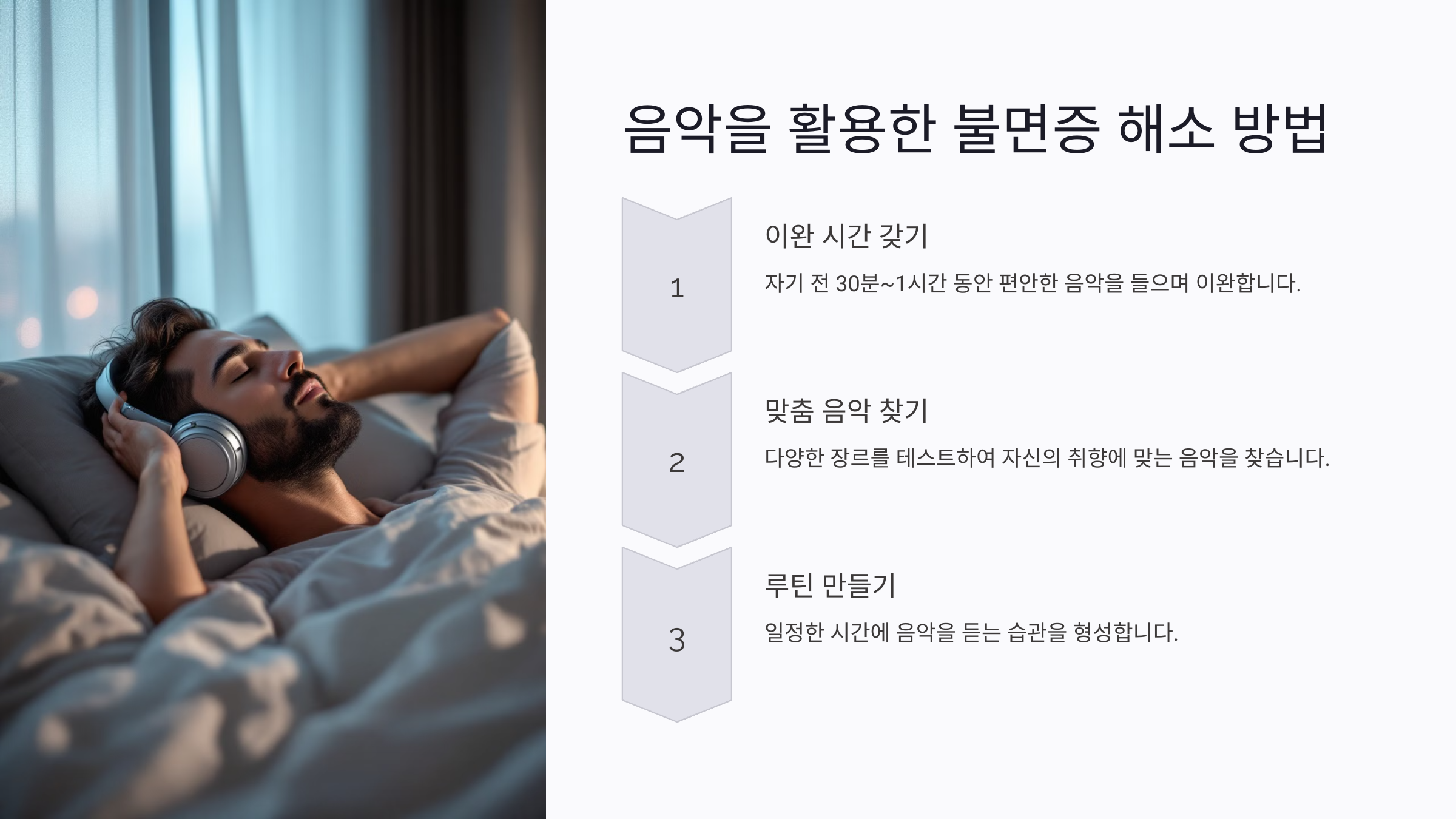 불면증을 음악으로 해결하려면 꾸준한 습관이 필요해요. 첫 번째로, 자기 전에 30분~1시간 정도 편안한 음악을 들으며 몸과 마음을 이완시키는 시간을 가지는 것이 좋아요. 이때 조명을 낮추고 침실 온도를 적절하게 유지하면 효과가 더 커져요.