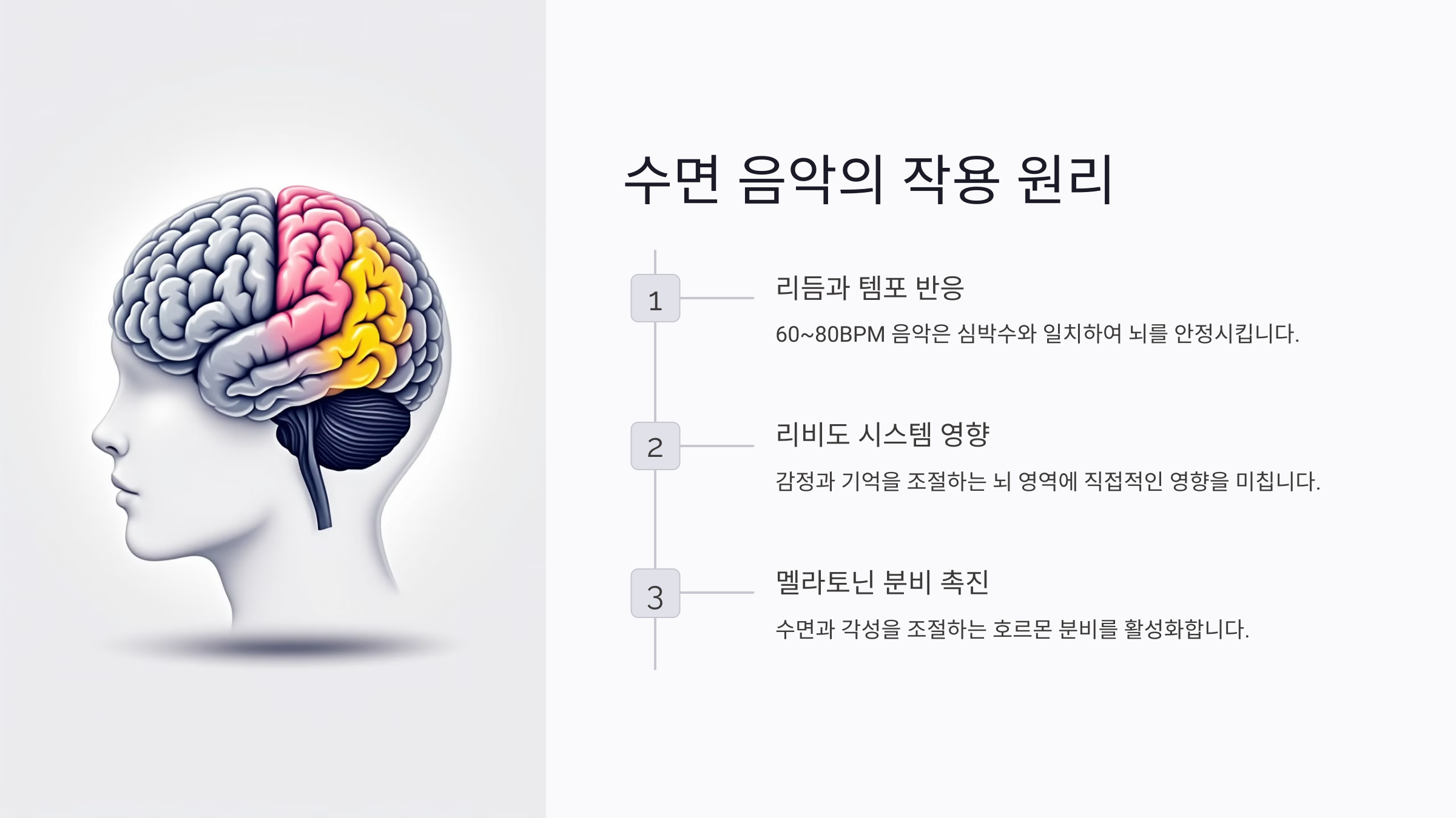 음악은 우리의 리비도 시스템(Limbic system)에 직접적인 영향을 미쳐요. 이 시스템은 감정과 기억을 조절하는 뇌의 영역으로, 음악을 들으면 마음이 편안해지고 스트레스가 줄어드는 이유가 바로 여기에 있어요. 특히, 일정한 리듬의 음악은 무의식적으로 뇌파를 조정해 깊은 수면 상태로 유도한답니다.