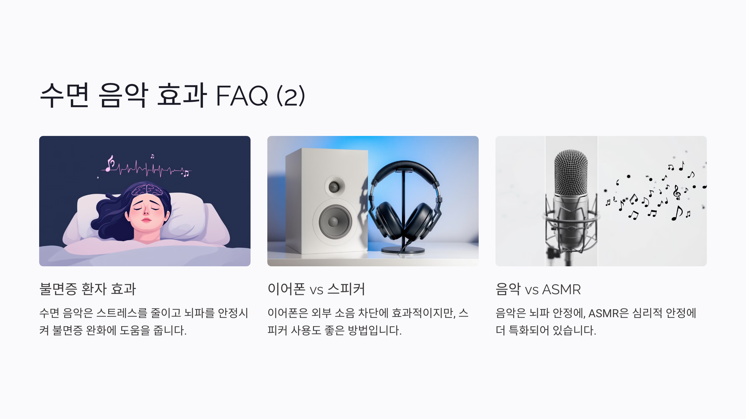 A6. 둘 다 효과가 있지만, 음악은 뇌파 안정에, ASMR은 심리적 안정을 주는 데 더 특화돼 있어요. 개인의 필요에 맞게 선택하면 돼요.