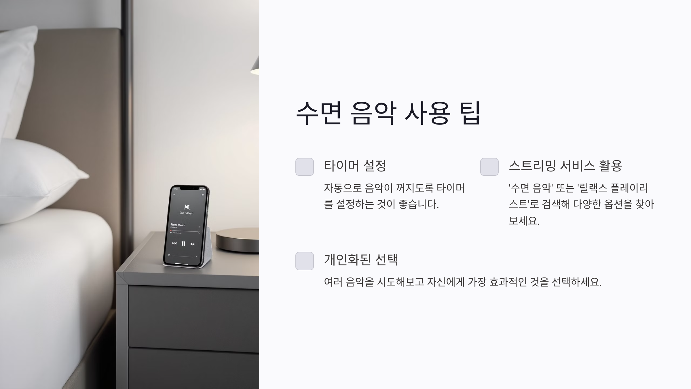또한, 너무 짧은 시간만 음악을 듣는 것도 문제예요. 최소 20분 이상 음악을 들어야 몸과 마음이 이완되며, 숙면에 적합한 상태로 변환될 수 있어요. 너무 조급하게 효과를 기대하지 말고 충분히 시간을 두고 시도해 보세요.