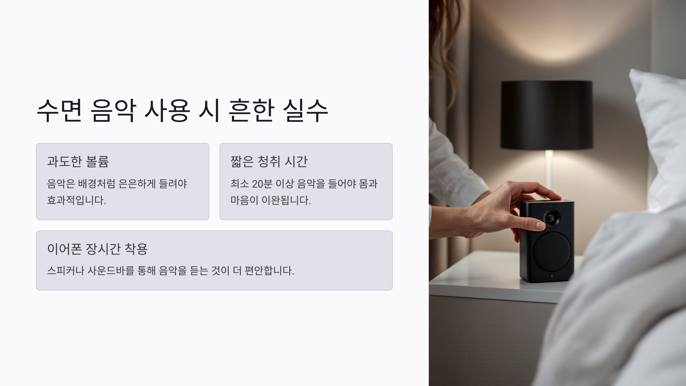 수면 음악을 활용할 때 흔히 하는 실수는 너무 큰 볼륨으로 음악을 듣는 것이에요. 음악은 배경처럼 은은하게 들려야 효과적이에요. 너무 큰 소리는 오히려 신경을 자극해 수면을 방해할 수 있답니다.