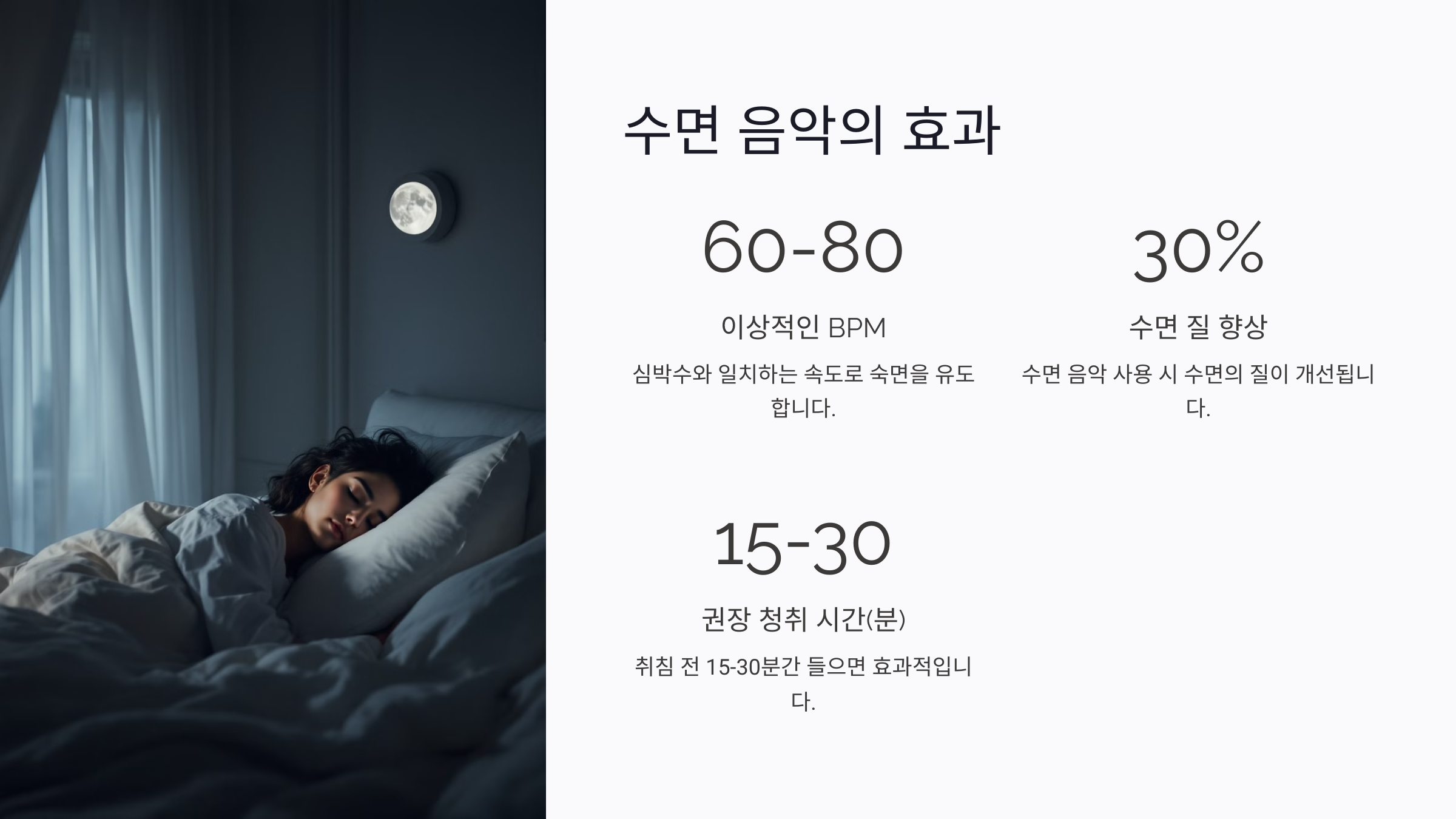 수면 음악은 뇌파를 델타파로 전환시켜, 더 깊고 안정된 잠에 도달하도록 도와줘요. 심박수와 호흡을 낮추며, 몸의 긴장을 완화해 자연스럽게 "잠드는 상태"로 이끌어주는 역할을 한답니다. 한국에서도 빗소리나 파도 소리 같은 자연 소리를 수면 음악으로 즐기는 경우가 많아요.