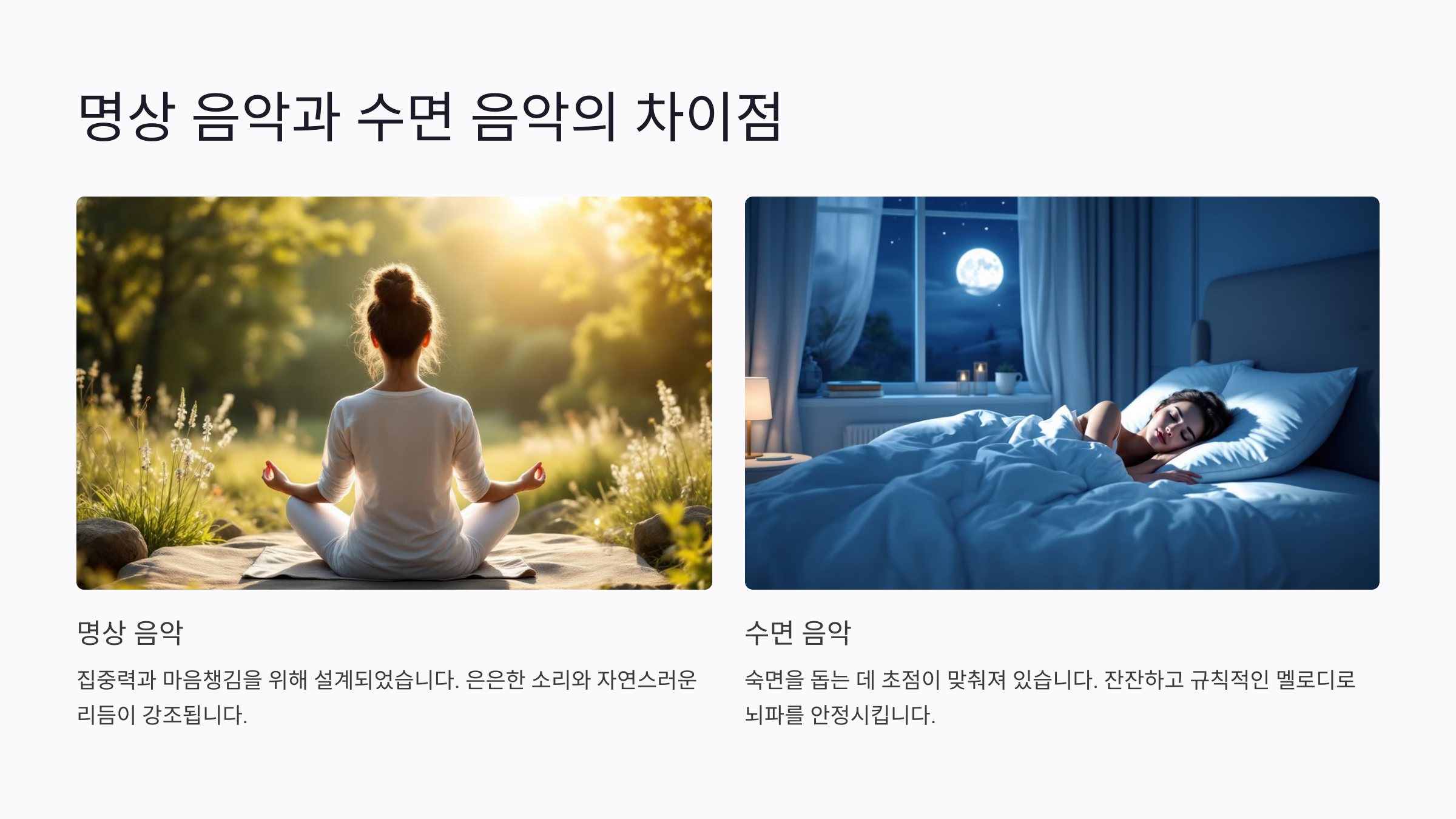 명상 음악과 수면 음악은 서로 비슷한 점도 있지만, 목적과 사용하는 방식에서 분명한 차이가 있어요. 가장 큰 차이는 사용 목적이에요. 명상 음악은 집중력과 마음챙김을 위한 것이고, 수면 음악은 숙면을 돕는 데 초점이 맞춰져 있답니다.