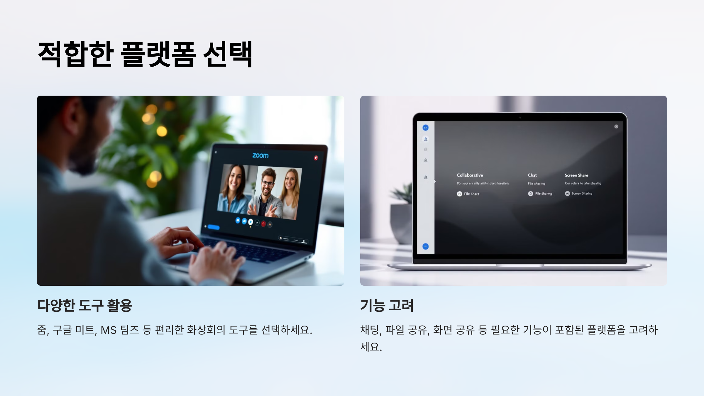 채팅, 파일 공유, 화면 공유 등 필요한 기능이 포함된 플랫폼을 고려하세요.