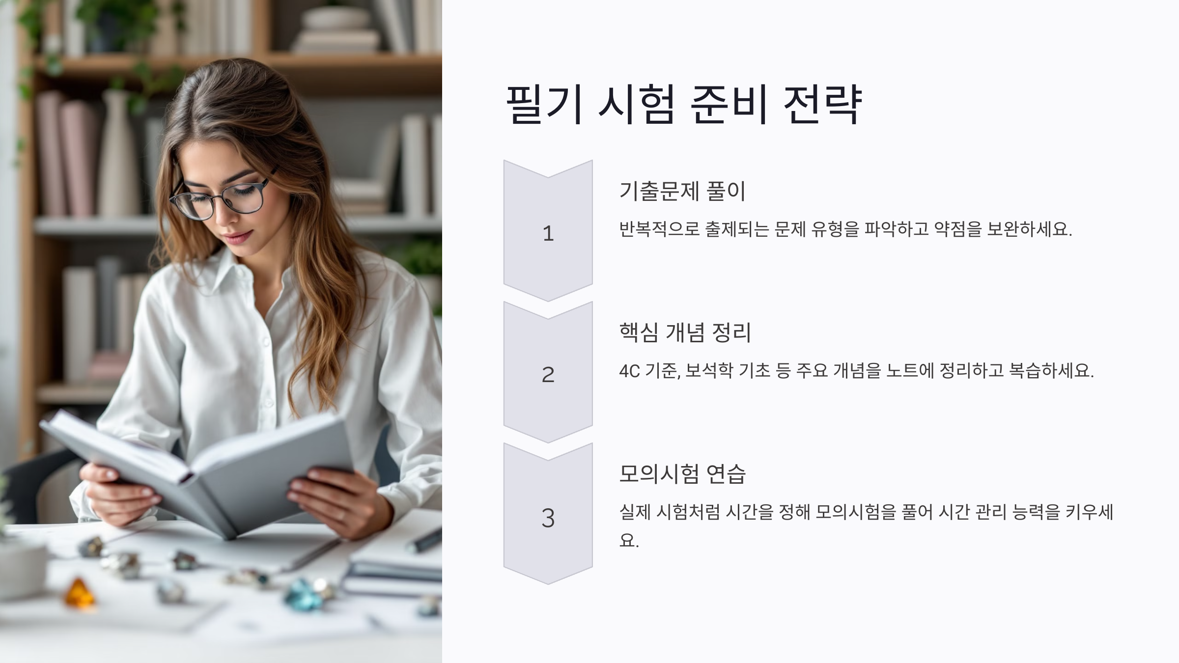 보석감정사 시험은 이론과 실무 능력을 동시에 평가하기 때문에 체계적인 준비가 필요해요. 아래는 필기와 실기 시험에 적합한 준비 전략을 소개할게요: