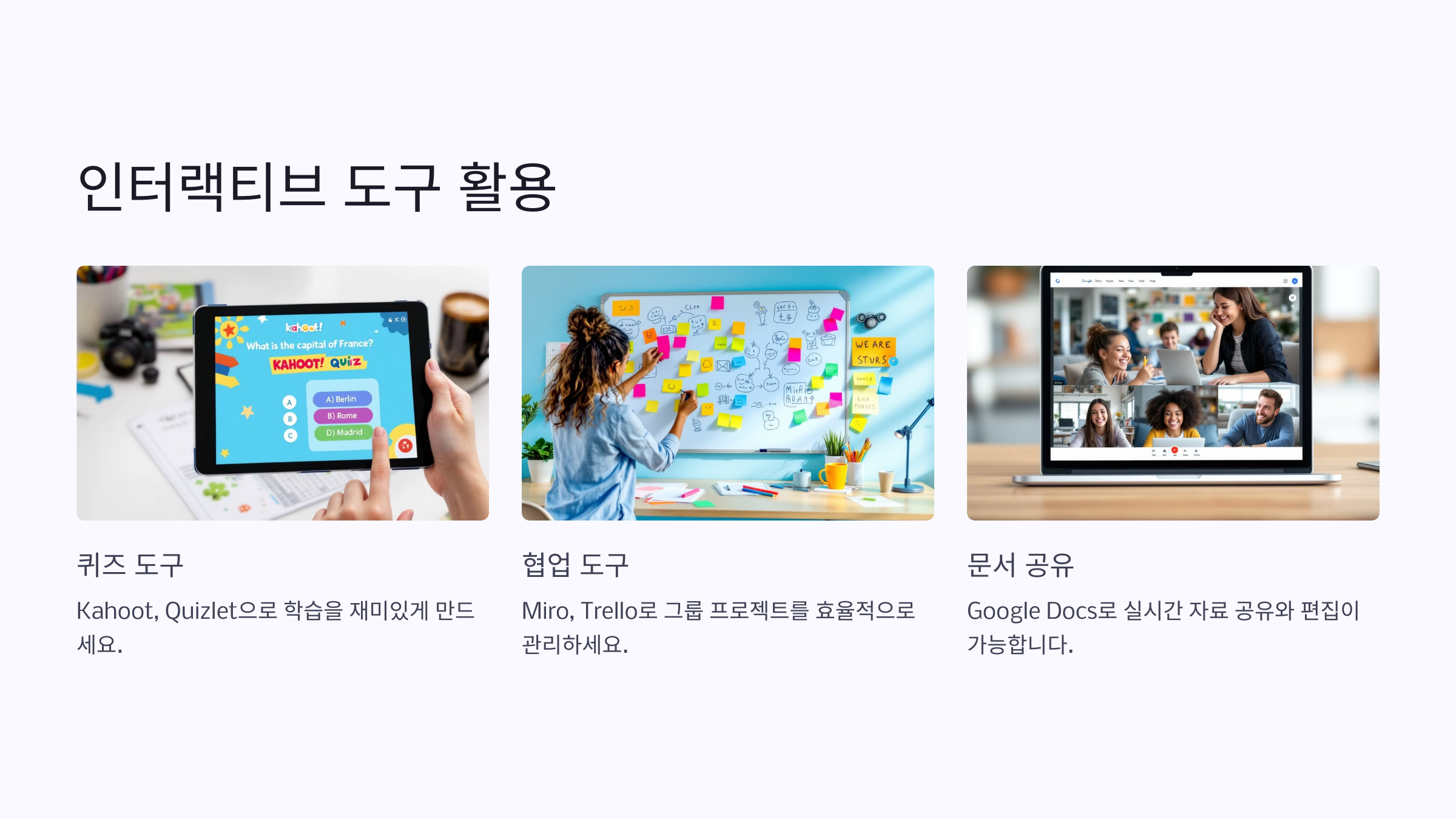 A: Kahoot, Quizlet, Trello 같은 도구를 추천합니다.