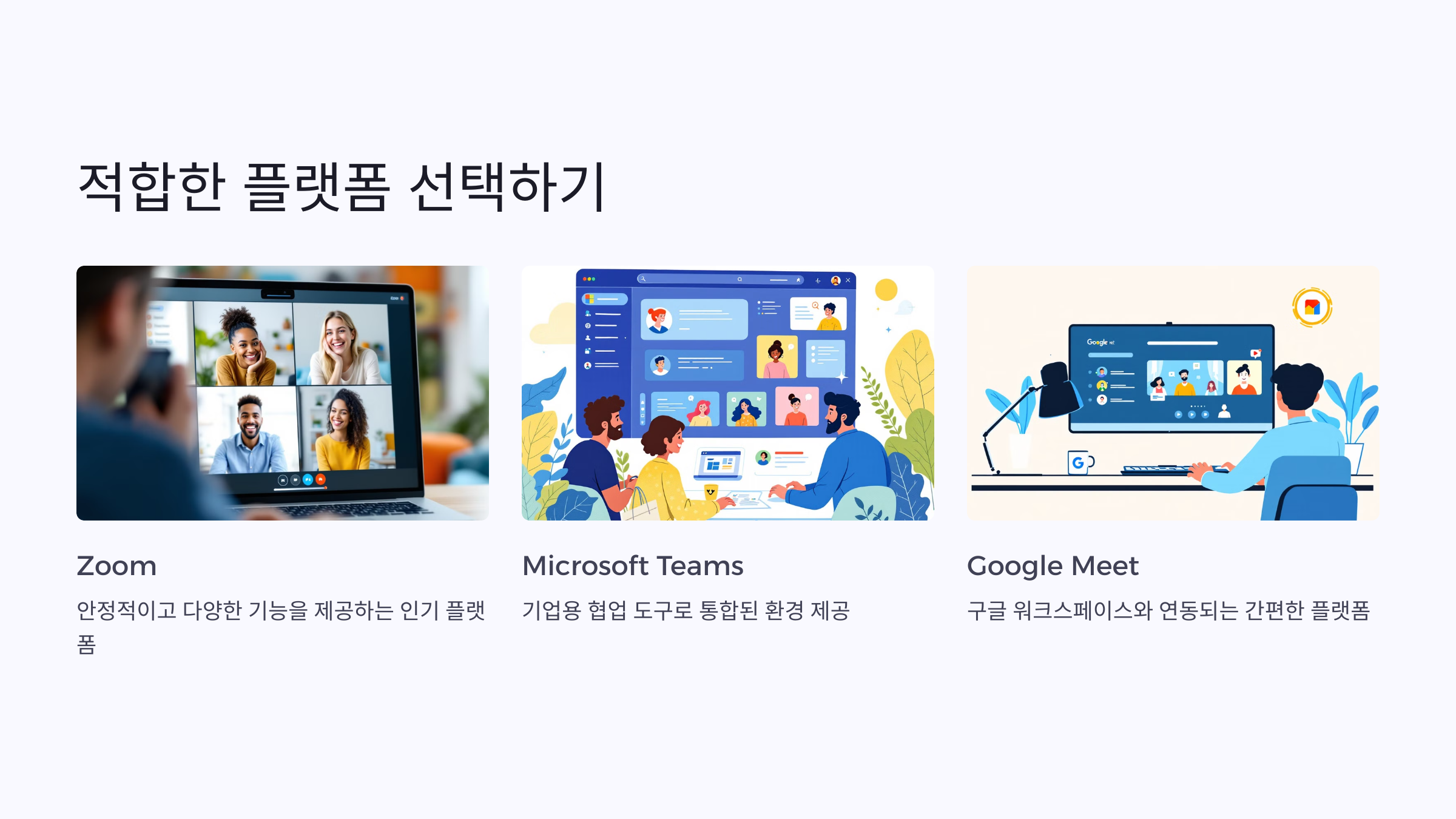 Zoom, Microsoft Teams, Google Meet 등 인기 있는 플랫폼을 비교해 보세요.
