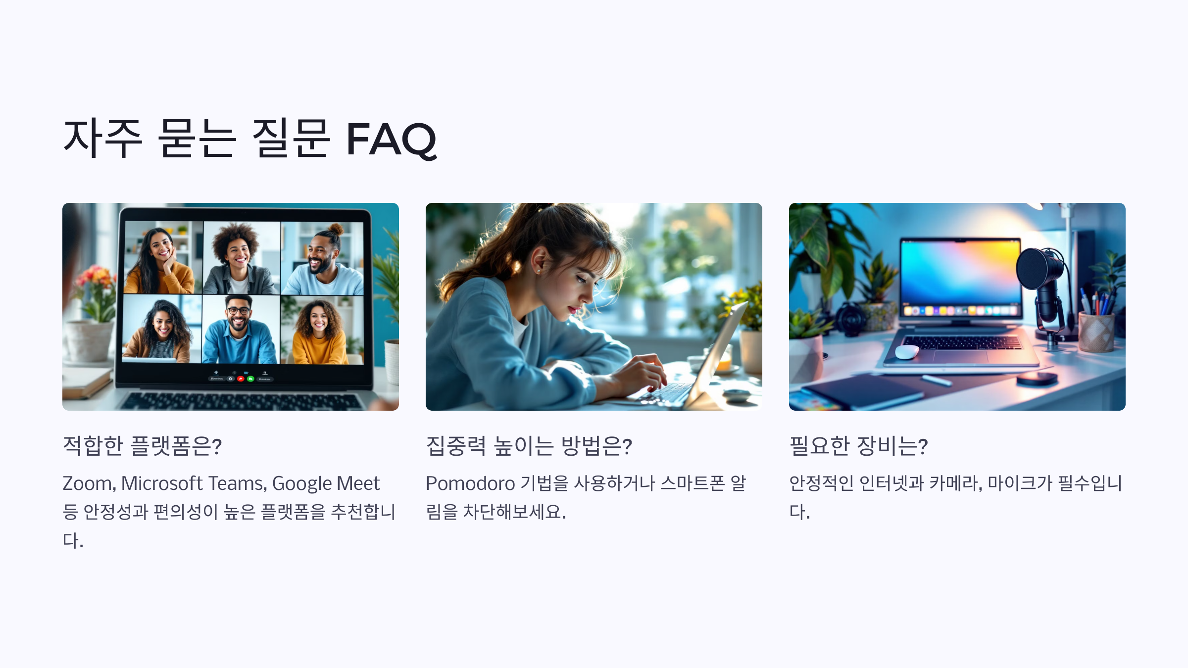 A: 안정적인 인터넷과 카메라, 마이크가 필수입니다.