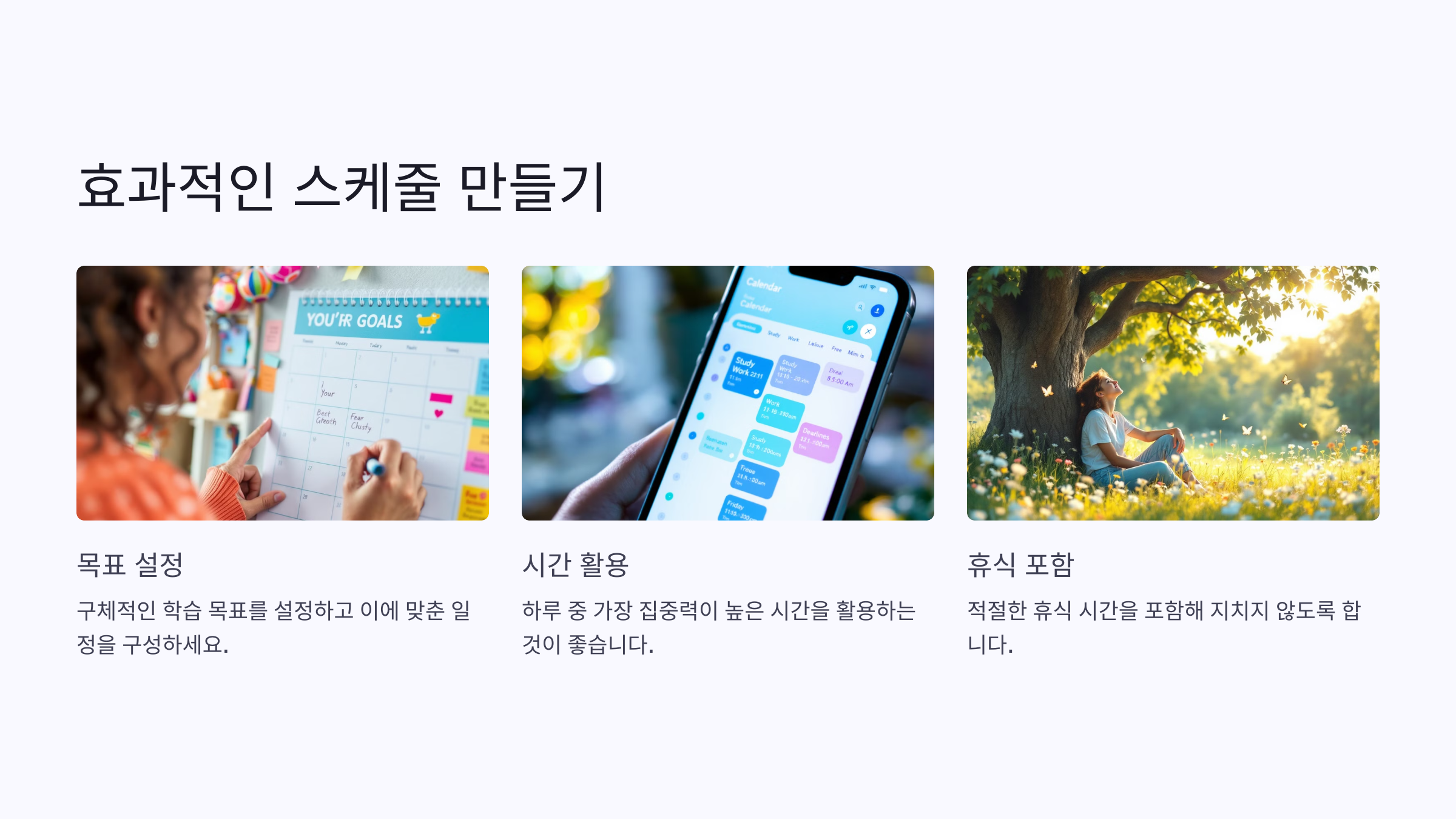 구체적인 학습 목표를 설정하고 이에 맞춘 일정을 구성하세요.