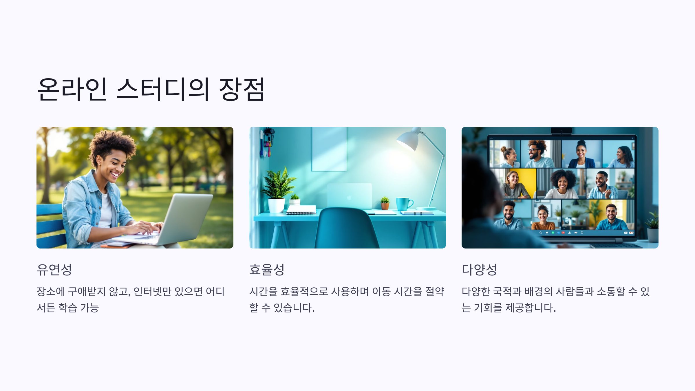 스터디 그룹 내 다양한 국적과 배경의 사람들과 소통할 수 있는 기회를 제공합니다.
