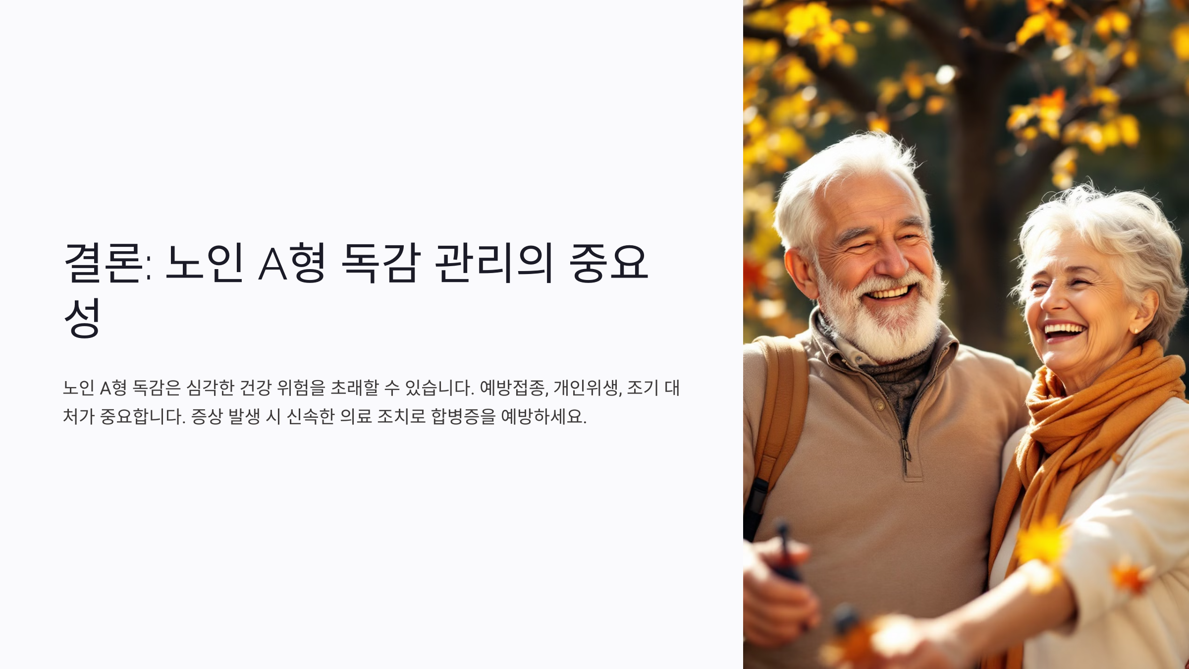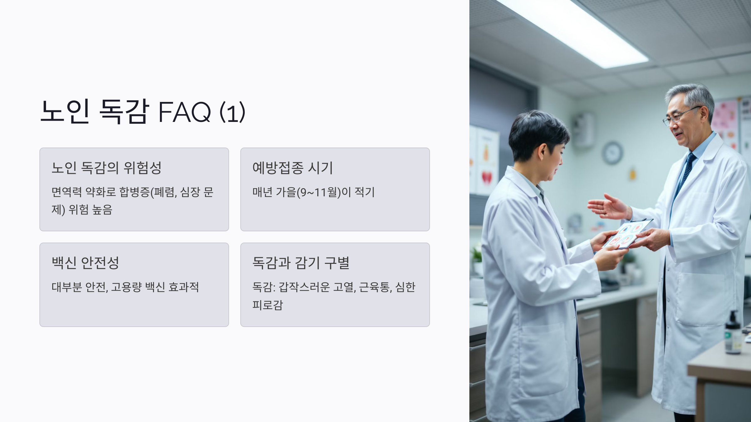 A1. 노인은 면역력이 약해 독감으로 인한 합병증(폐렴, 심장 문제 등) 위험이 매우 높아요.