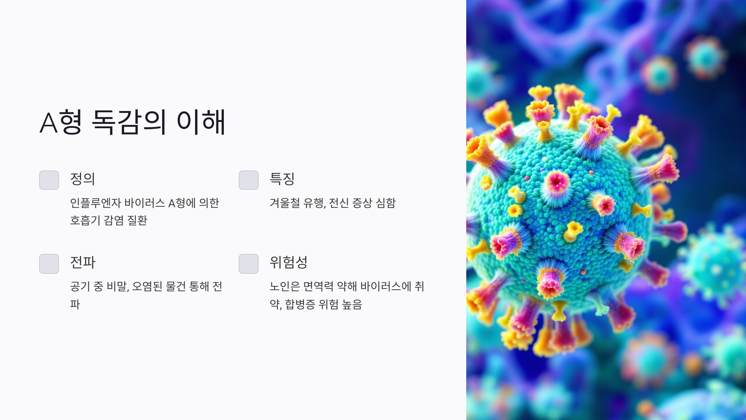 A형 독감은 인플루엔자 바이러스 A형에 의해 발생하는 호흡기 감염 질환이에요. 일반적으로 겨울철 유행하며, 전신 증상이 심하게 나타나는 것이 특징이에요. 고령자는 이 바이러스에 특히 취약하답니다.