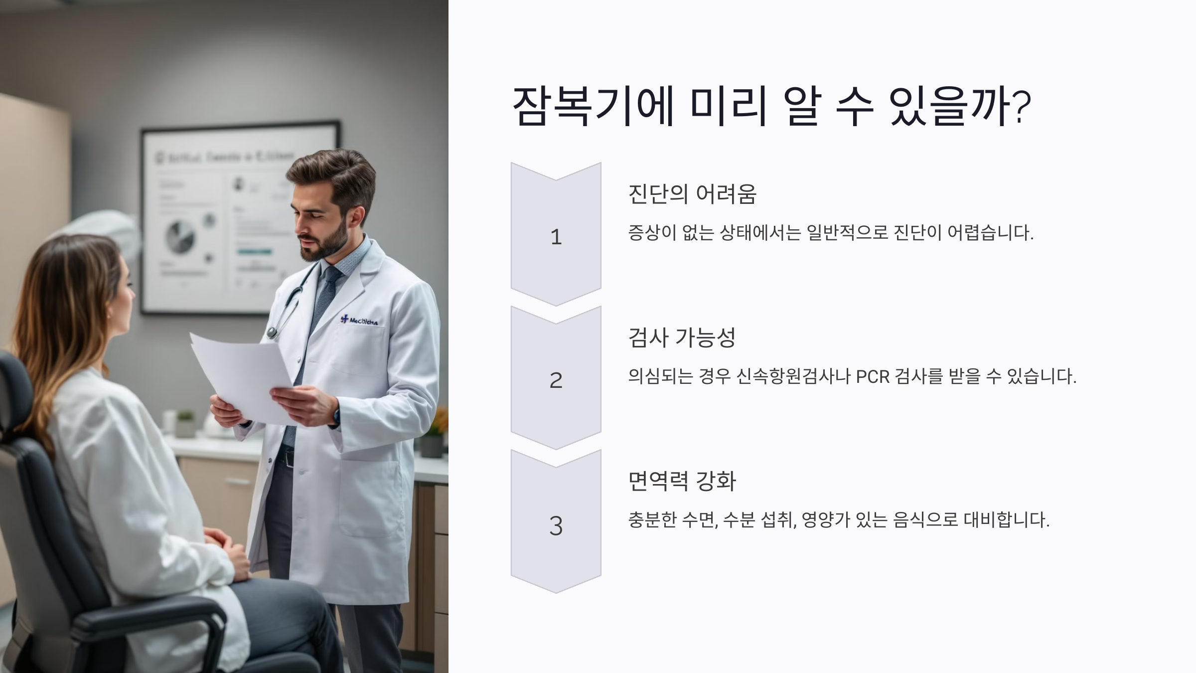 잠복기 동안에는 고열, 기침, 목 통증 같은 전형적인 증상이 나타나지 않지만, 일부 사람들은 몸살 기운, 가벼운 두통, 피로감 같은 미미한 신호를 느끼기도 해요. 하지만 이런 신호는 다른 원인으로 오해하기 쉽답니다.