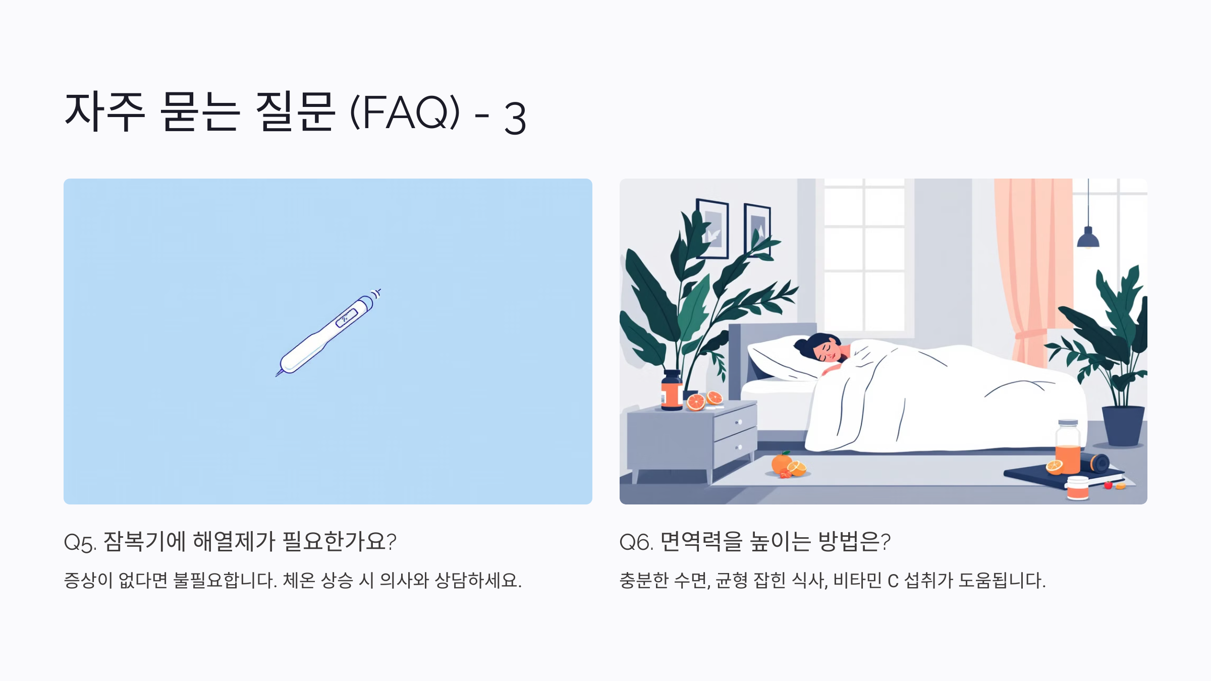 A5. 증상이 없다면 해열제를 먹을 필요는 없어요. 체온이 높아질 경우 의사와 상의하세요.