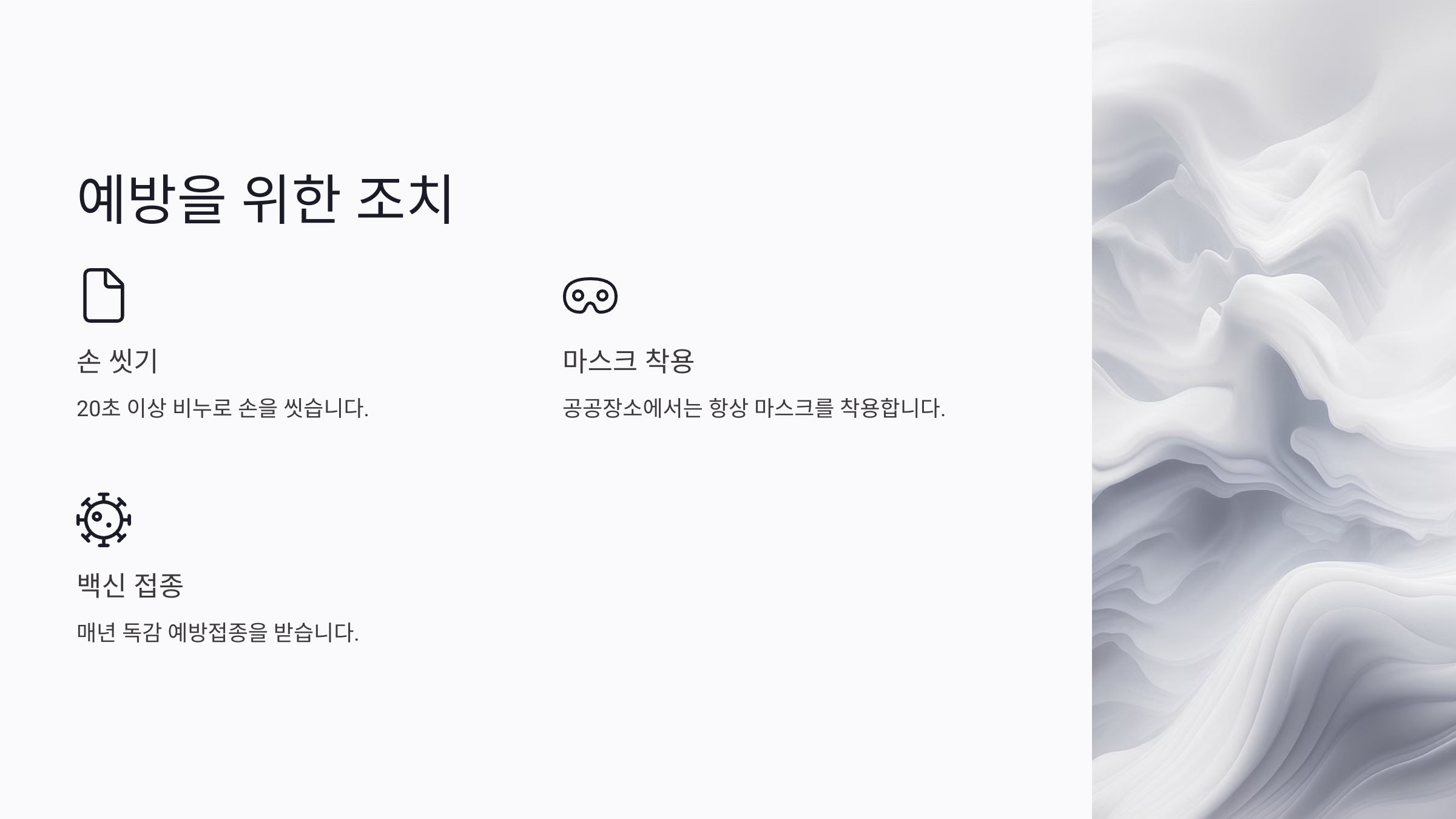 그리고 무엇보다 독감 백신 접종이 가장 효과적인 예방 방법이에요. 백신은 독감 바이러스의 확산을 막고, 감염되더라도 증상을 약화시키는 데 도움을 줘요. 매년 예방접종을 통해 자신과 가족을 보호하세요.