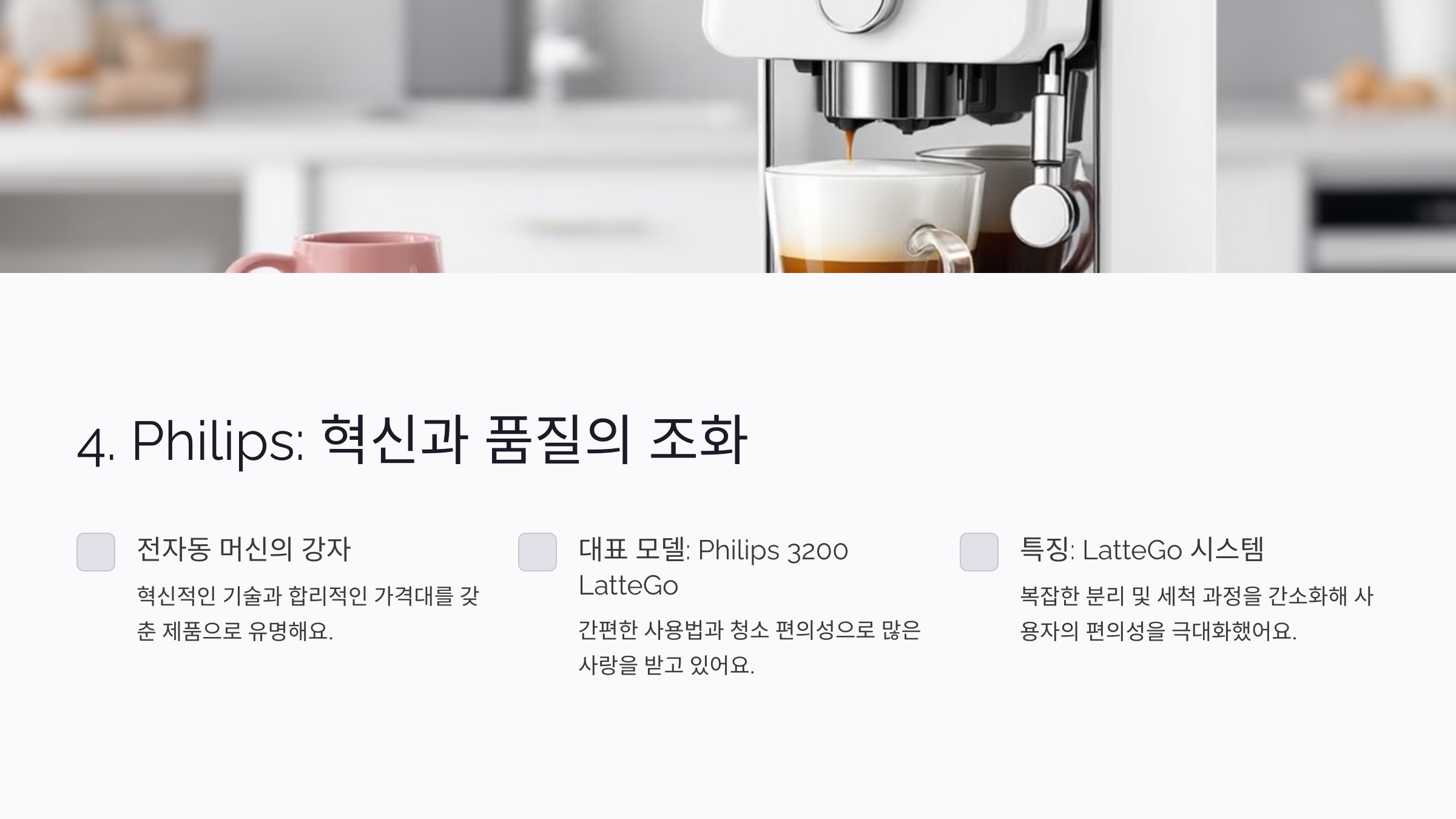 Philips는 전 세계적으로 신뢰받는 가전 브랜드로, 커피머신 분야에서도 그 명성을 이어가고 있어요. 특히 전자동 머신으로 유명하며, 혁신적인 기술과 합리적인 가격대를 갖춘 제품을 선보이고 있어요. 가정과 사무실 모두에서 사용하기에 적합한 모델들이 많답니다.