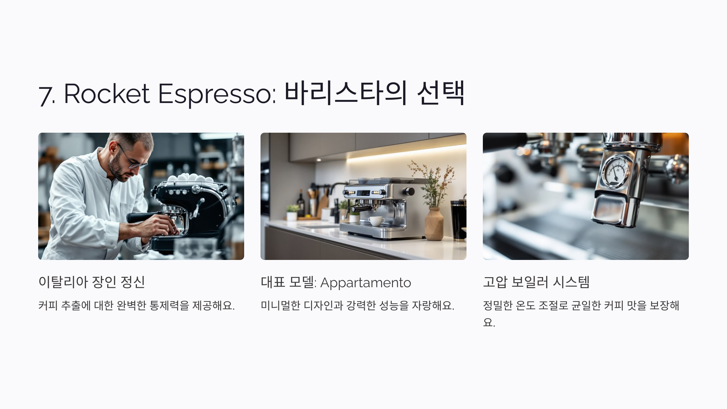 Rocket Espresso의 대표 모델인 "Appartamento"는 미니멀한 디자인과 강력한 성능을 자랑하며, 가정에서도 카페 수준의 커피를 즐길 수 있도록 해줘요. 고압 보일러 시스템과 정밀한 온도 조절 기능으로 매번 균일한 커피 맛을 보장해요.