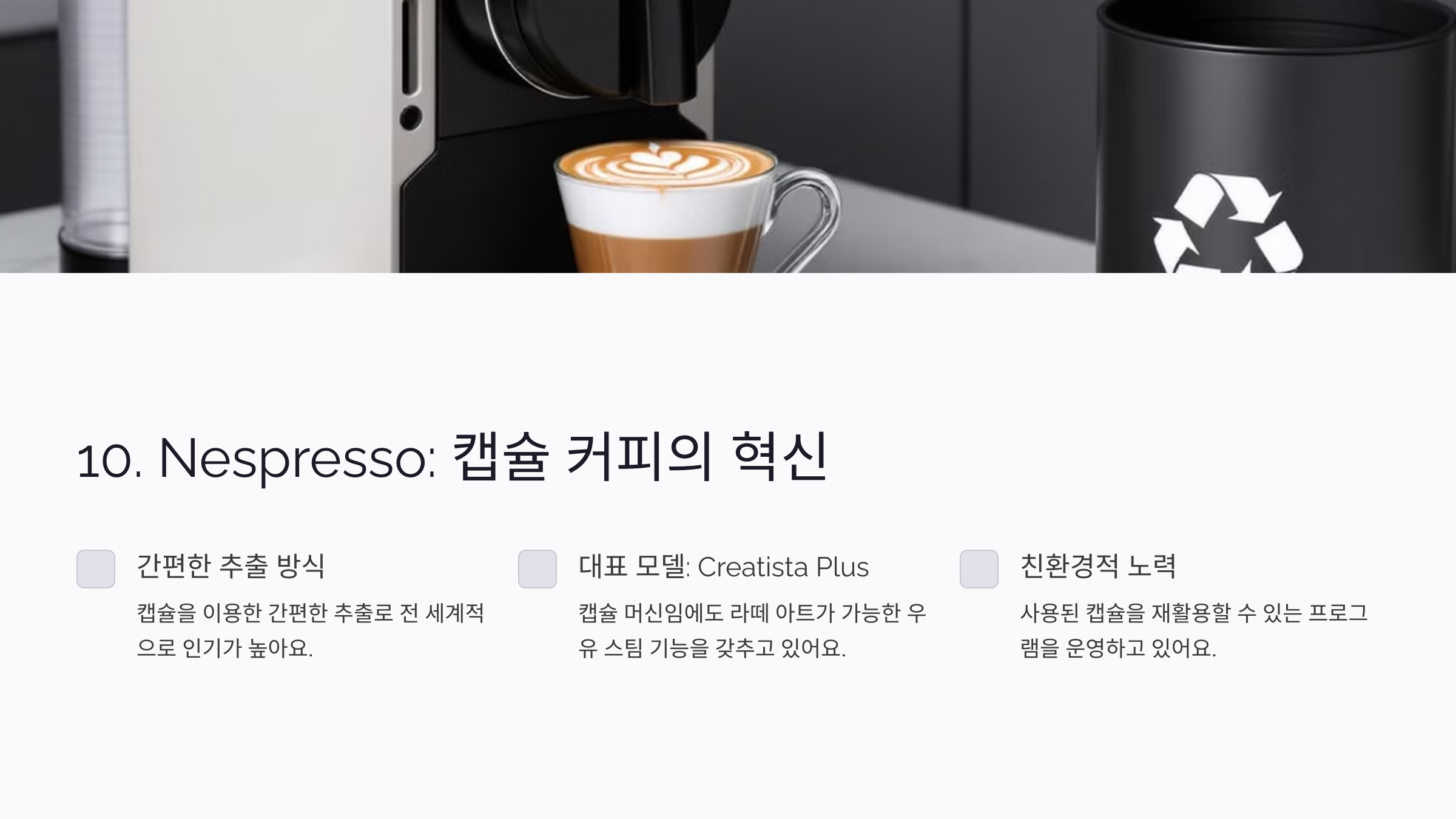 Nespresso의 대표 모델 중 하나는 "Creatista Plus"로, 캡슐 커피 머신임에도 불구하고 라떼 아트까지 가능한 우유 스팀 기능을 갖추고 있어요. 사용이 간편하면서도 고급스러운 커피 경험을 제공한다는 점이 매력적이에요.