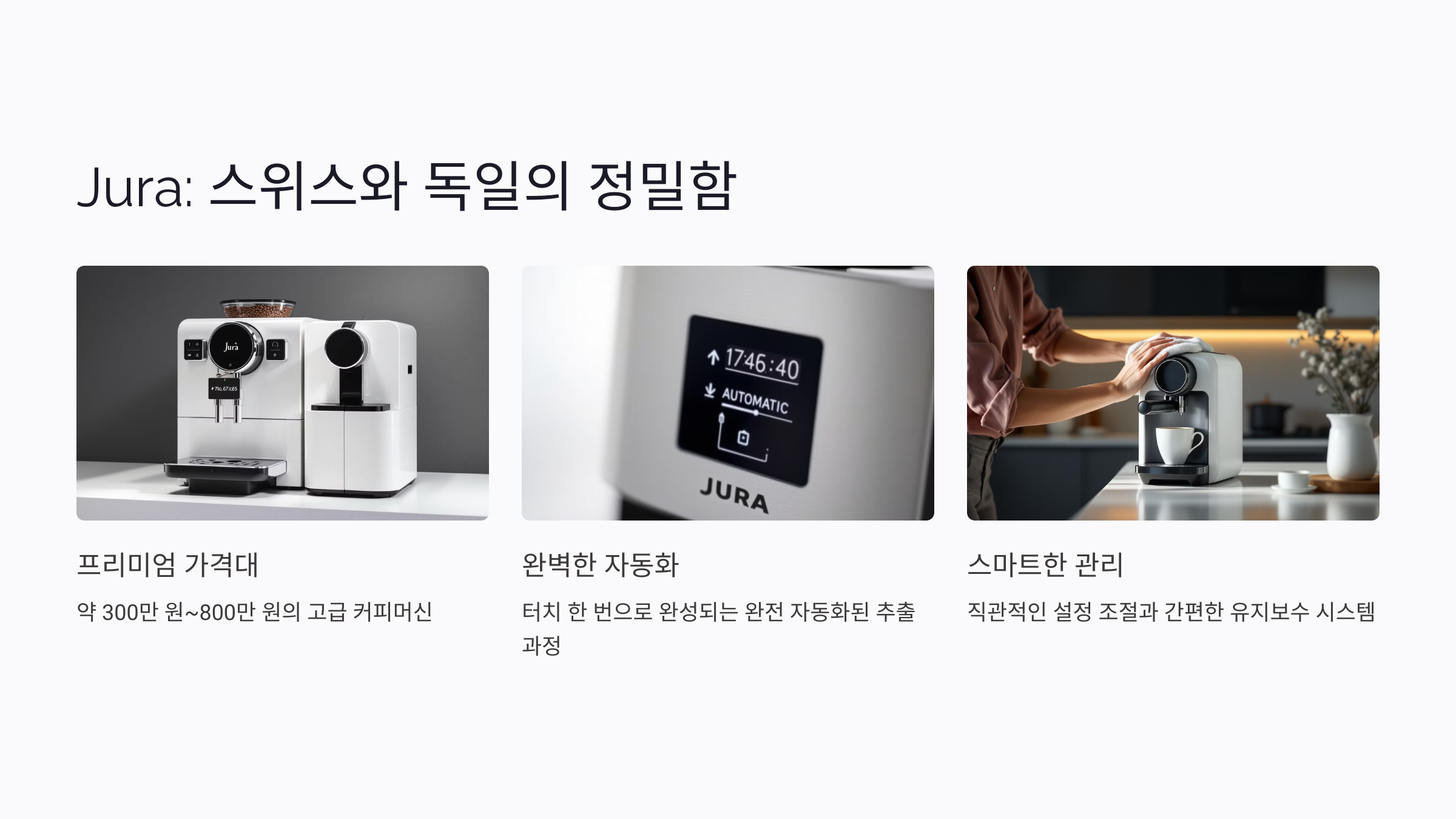 Jura 머신은 추출 과정을 완전히 자동화하면서도, 사용자가 원하는 대로 설정할 수 있는 유연성을 제공해요. 유지보수가 자동화되어 있어 사용이 매우 간편하고, 뛰어난 디자인 또한 Jura의 매력 중 하나예요. 고급스러운 커피 경험을 원한다면 Jura가 최적의 선택이 될 거예요.