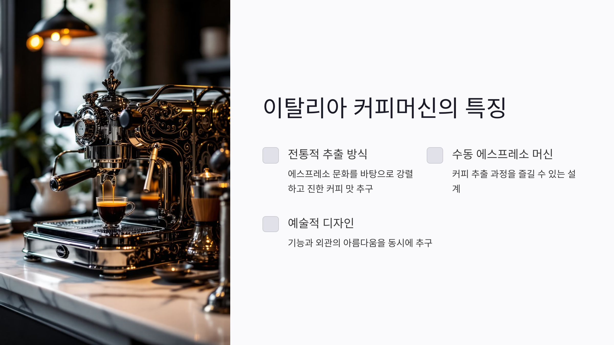 이탈리아는 커피의 본고장이에요. 특히 에스프레소 문화가 발달해 커피머신 설계에서도 전통적인 커피 추출 방식을 강조하죠. 이탈리아 브랜드는 대체로 강렬하고 진한 커피 맛을 추구하며, 섬세한 디자인 감각을 자랑해요.