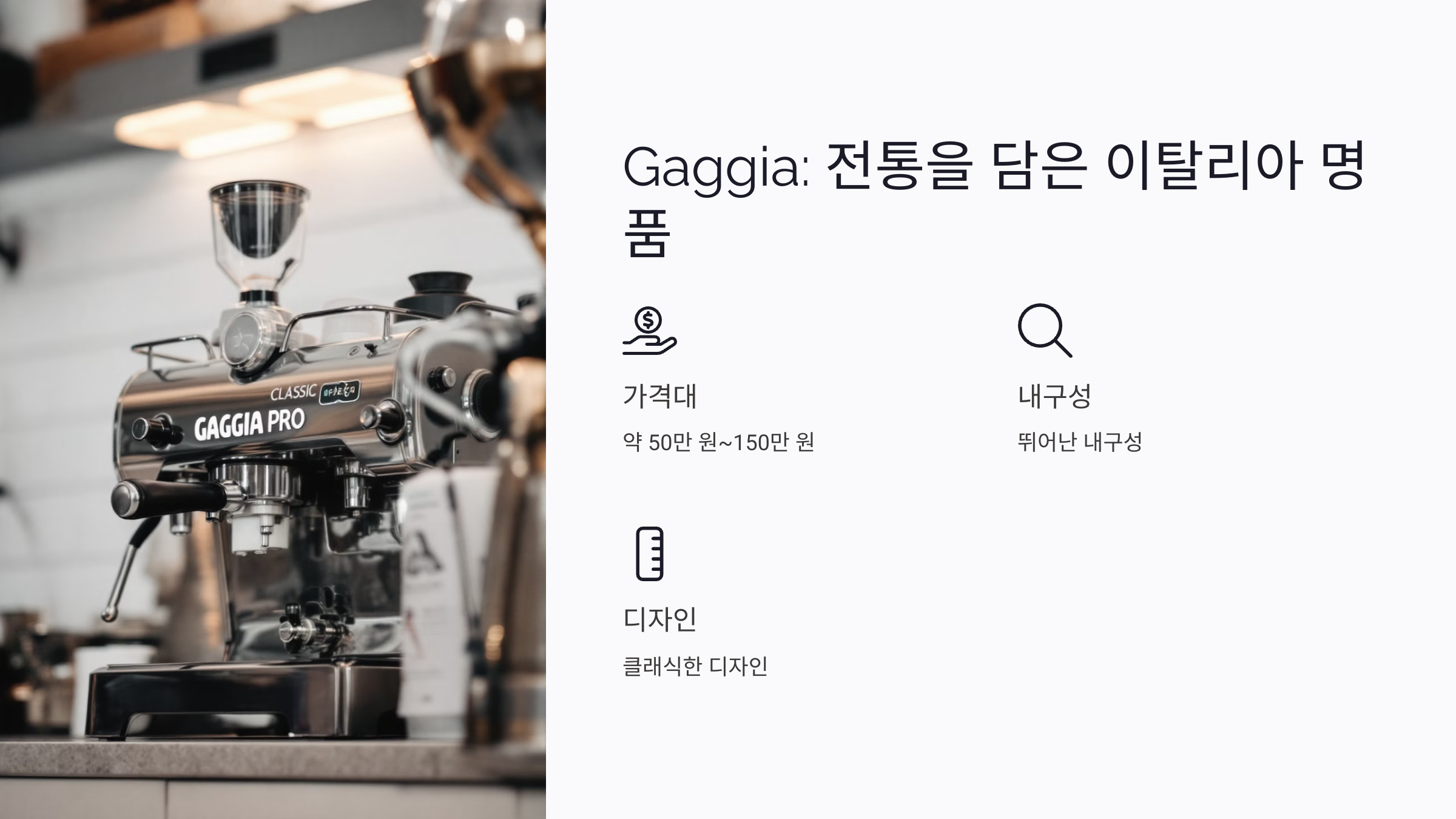 Gaggia는 이탈리아 커피머신의 전통과 역사를 대표하는 브랜드예요. 특히 "Classic Pro" 모델은 가정용 수동 에스프레소 머신의 대표작으로, 약 70만 원대의 가격으로 전통적인 에스프레소 추출을 가능하게 해줘요.