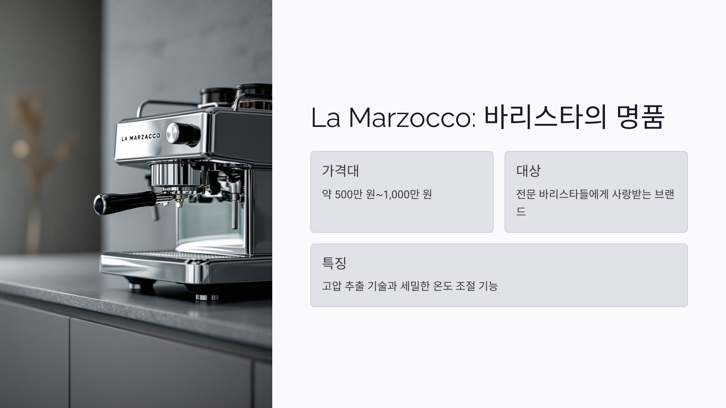 La Marzocco는 전문 바리스타들에게 사랑받는 브랜드로, 고급 에스프레소 머신의 정점에 있어요. 대표 모델 "Linea Mini"는 약 800만 원대로, 소규모 카페나 홈카페에 적합한 최고의 기기랍니다.