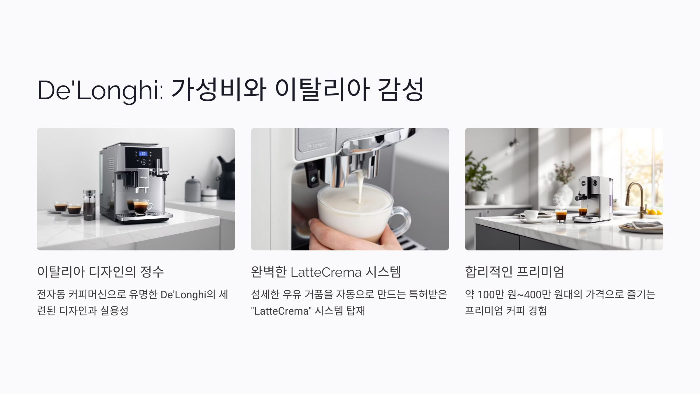 우유 거품을 섬세하게 만들어주는 "LatteCrema" 시스템은 이 브랜드만의 강점이며, 라떼나 카푸치노를 좋아하는 분들에게 딱 맞아요. 합리적인 가격과 간단한 유지보수 기능은 많은 소비자들에게 매력적으로 다가가요.