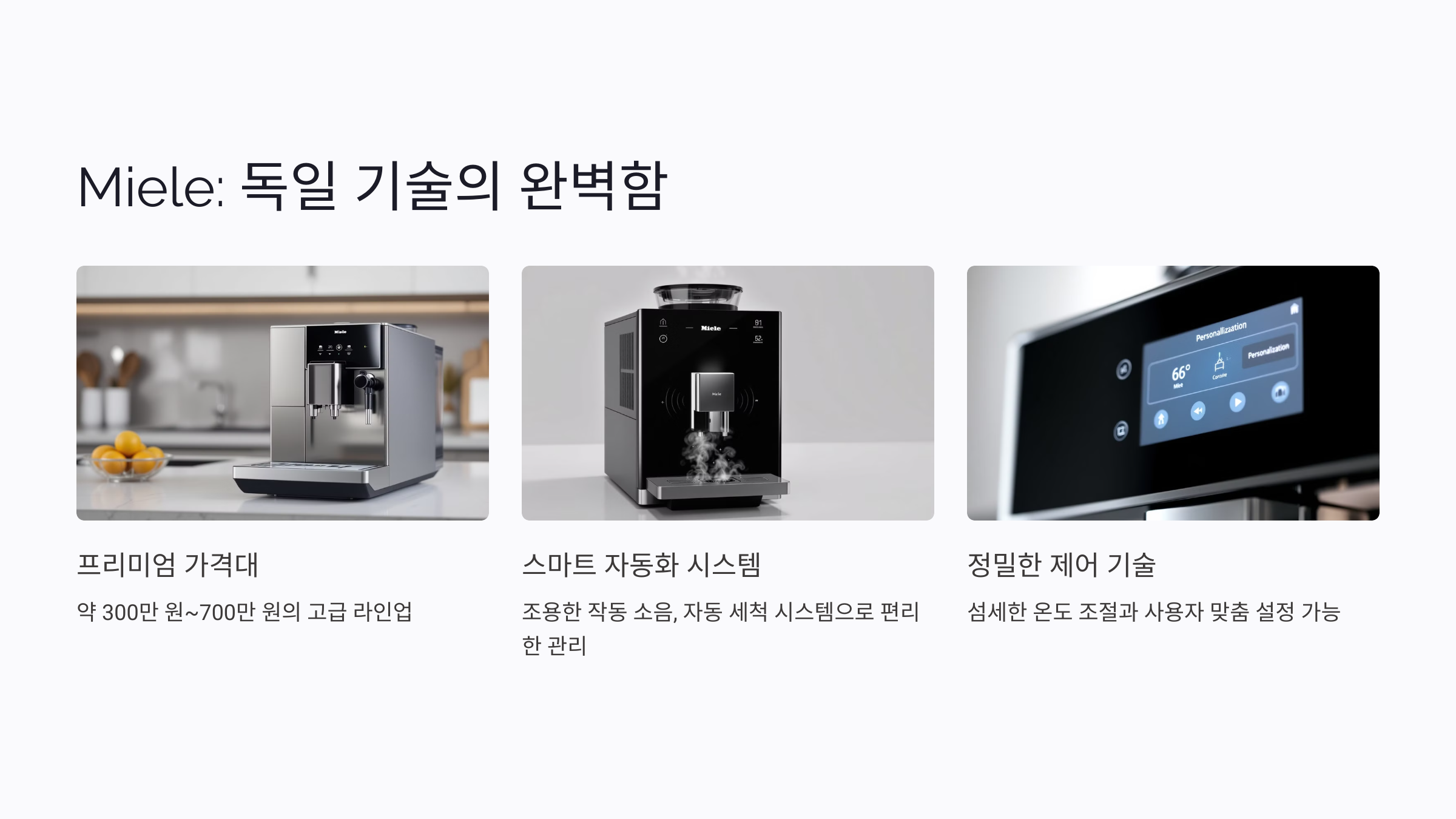 특히 조용한 작동 소음과 자동 세척 시스템은 Miele의 강점이에요. 또한, 섬세한 온도 조절과 사용자 맞춤 설정 기능은 커피 애호가들에게 높은 만족감을 제공해요. Miele는 기술력과 내구성을 중시하는 분들에게 적극 추천할 수 있는 브랜드랍니다.