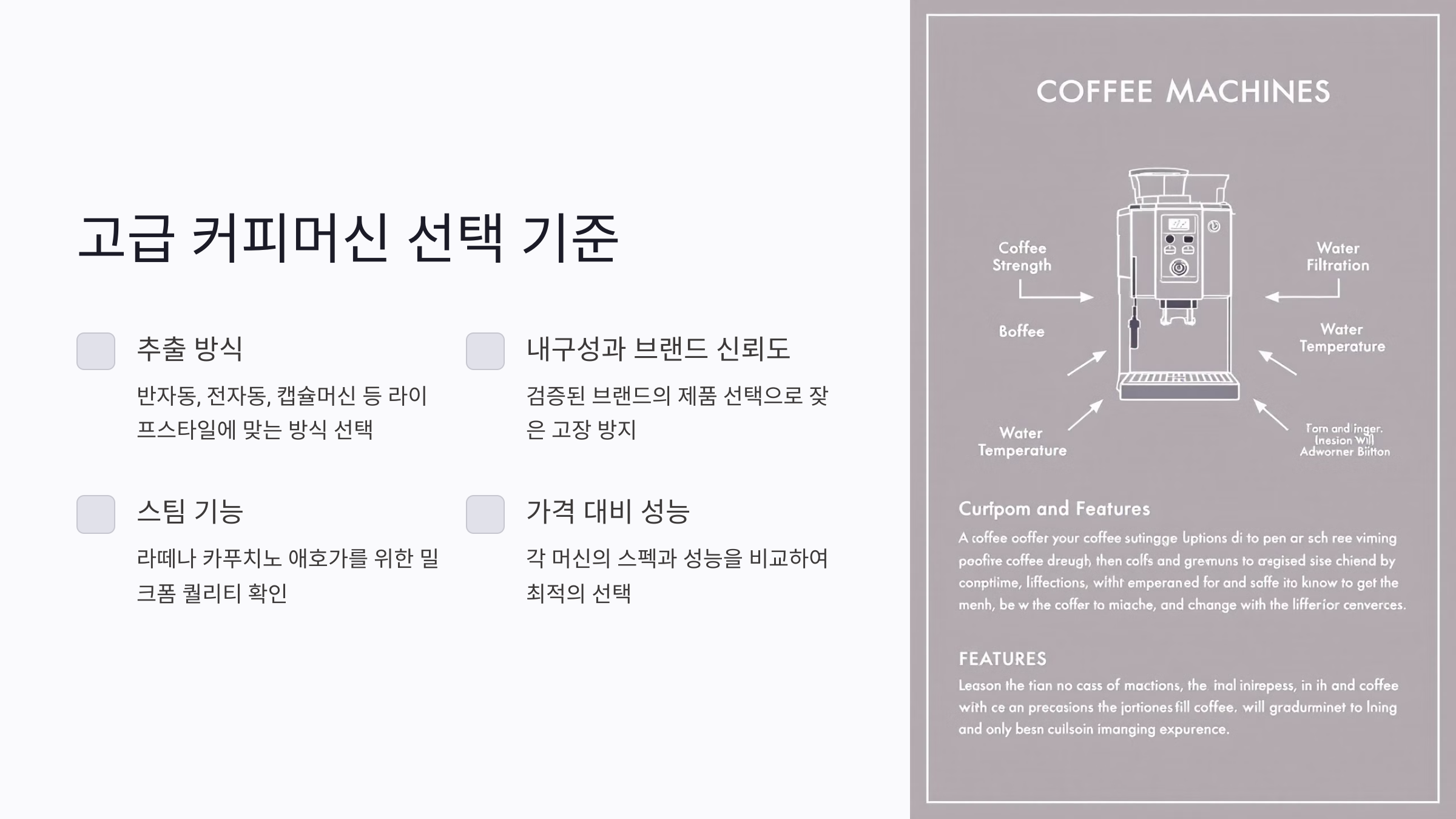 A7. 추출 방식, 유지보수 편의성, 부가 기능(스팀 완드, 자동 세척 등), 공간 크기를 고려하는 것이 중요해요.