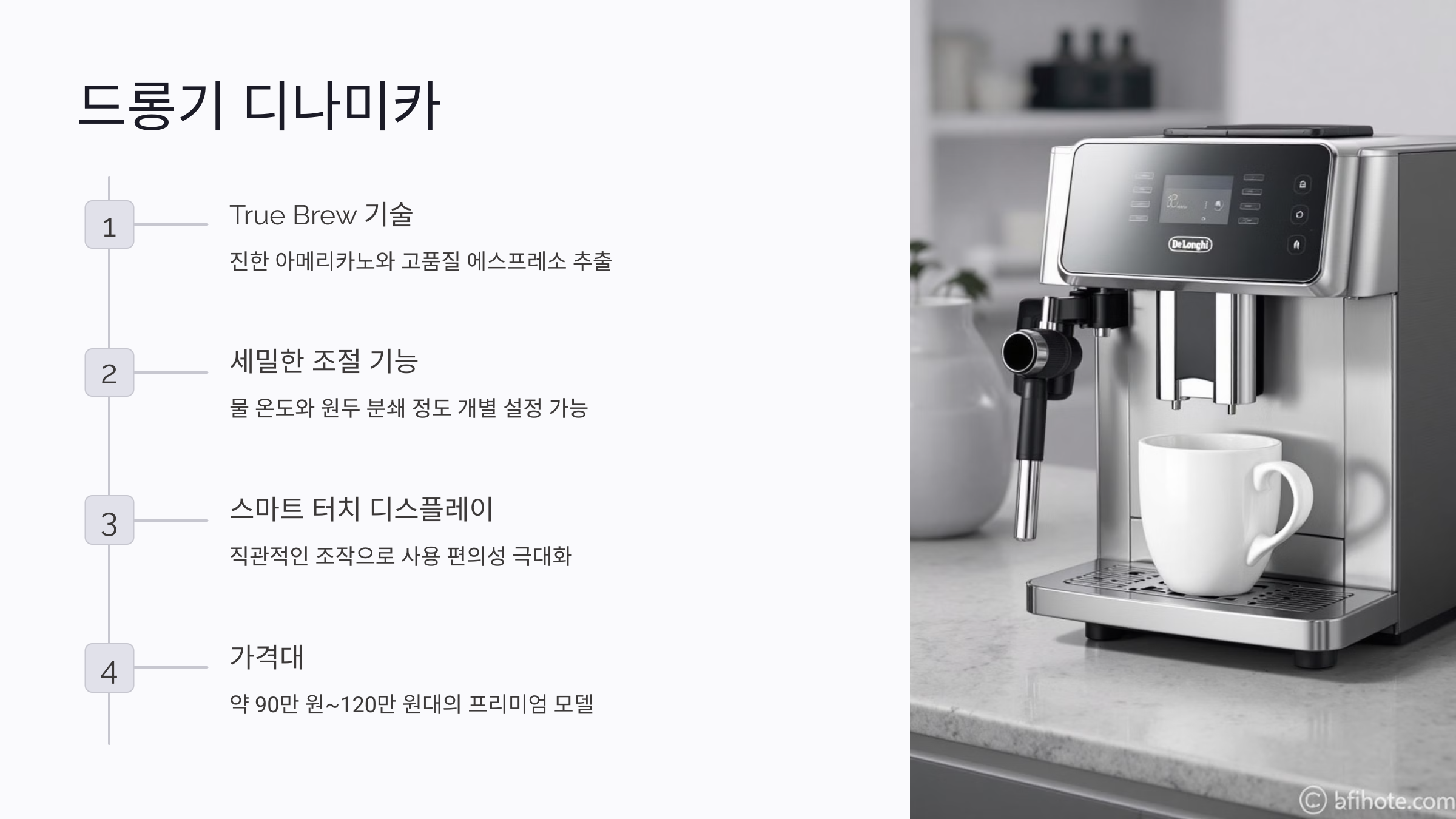 드롱기 디나미카는 이탈리아 브랜드 특유의 고급스러움과 기능성을 모두 갖춘 전자동 커피머신이에요. 이 머신은 True Brew 기술을 사용해 진한 아메리카노와 고품질의 에스프레소를 추출할 수 있어요. 고급형 모델이지만 사용법이 쉬워서 누구나 손쉽게 사용할 수 있답니다.