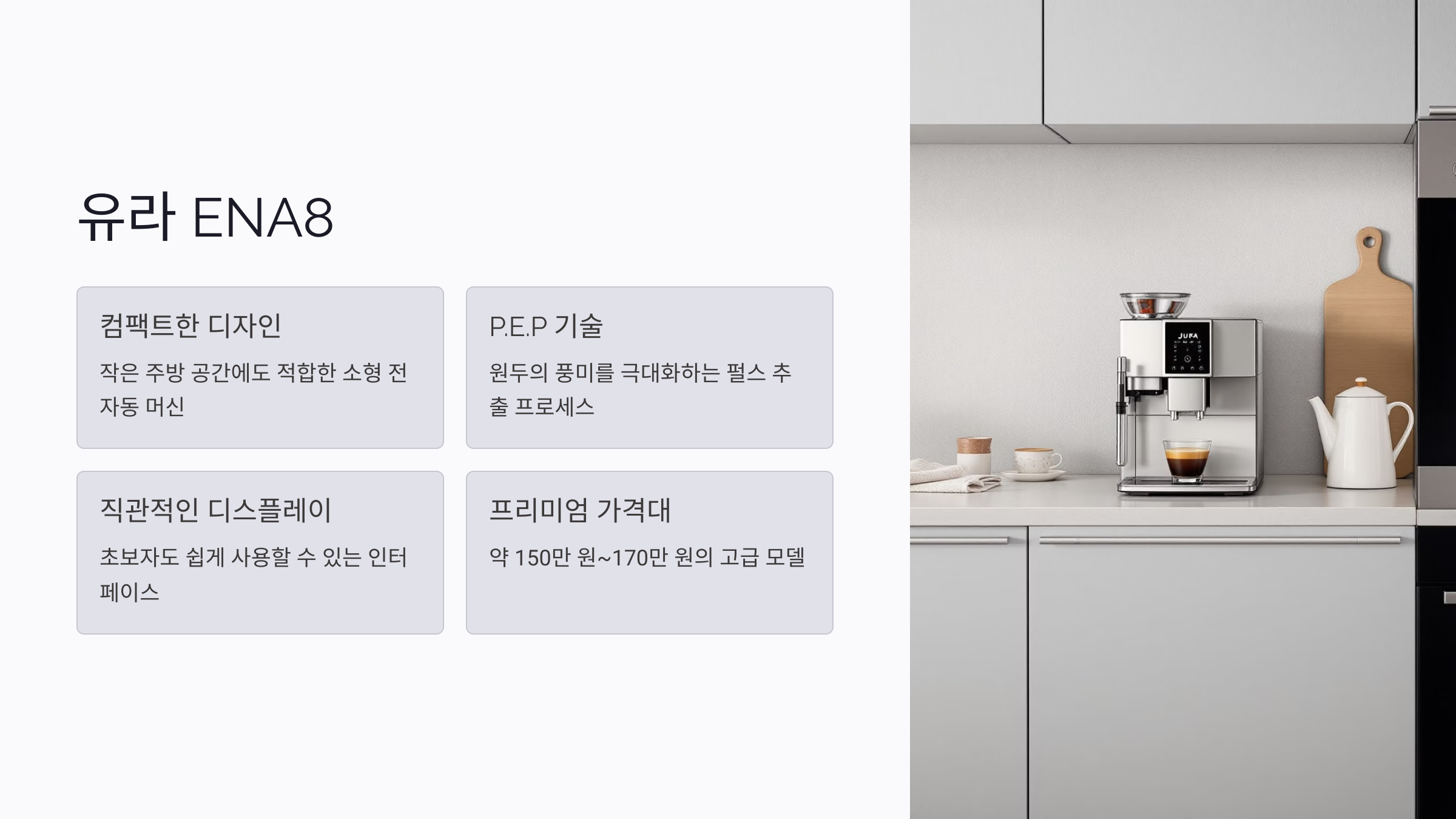 유라 ENA8은 작지만 강력한 성능을 가진 커피머신으로, 세련된 라이프스타일을 추구하는 분들에게 딱 맞는 제품이에요.