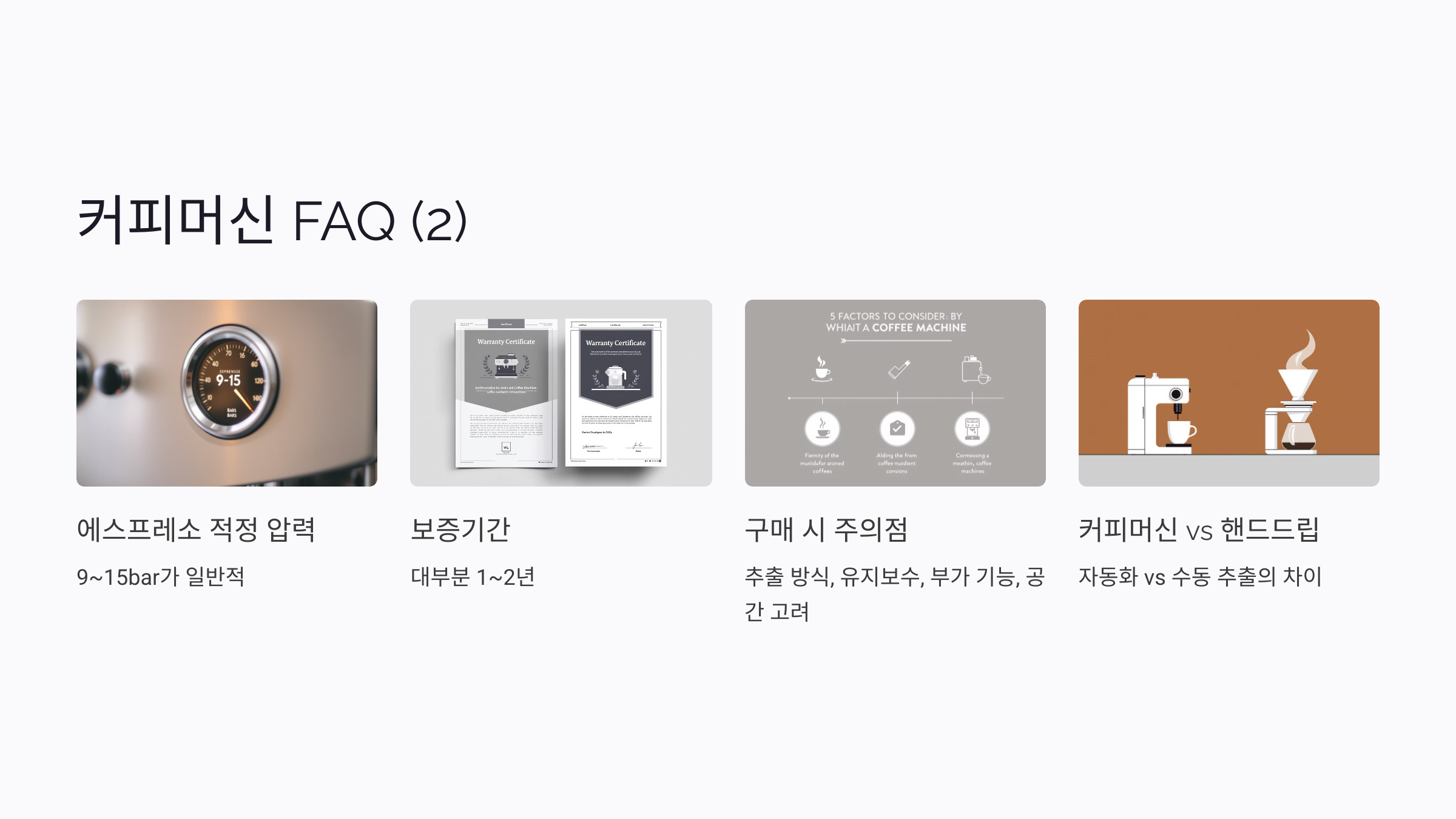 A5. 대부분의 커피머신은 9~15bar로 설계되어 있으며, 이 압력 범위가 맛있는 에스프레소 추출에 적합해요.