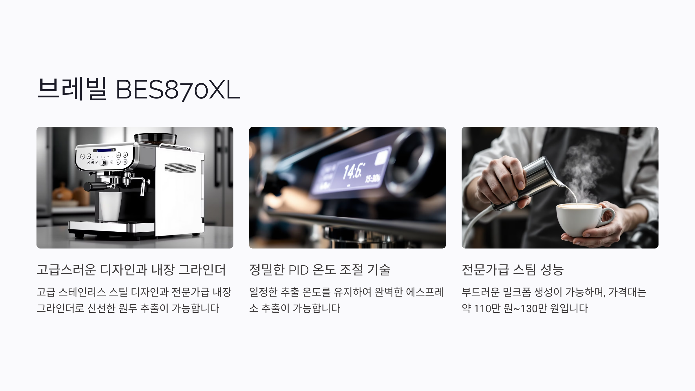브레빌 BES870XL은 안정적인 성능과 간편한 조작을 원하는 분들에게 추천할 만한 머신이에요. 특히, 추출 과정을 세세히 컨트롤하고 싶은 커피 애호가라면 후회 없는 선택이 될 거예요.