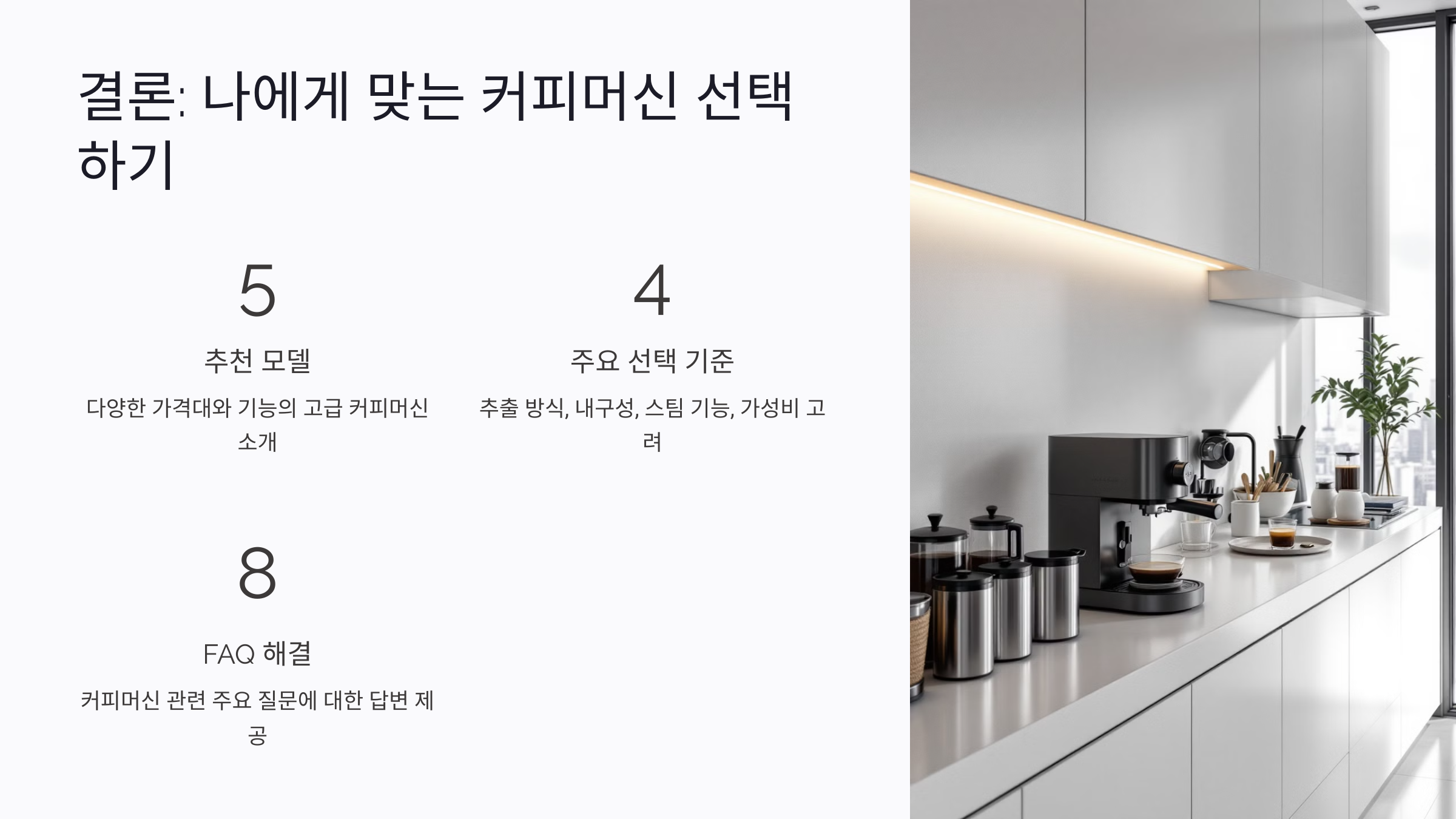 A4. 예산과 커피 소비 패턴에 따라 선택이 달라져요. 자주 사용하고 다양한 메뉴를 원하면 고급 모델이, 가벼운 사용에는 가성비 모델이 적합해요.