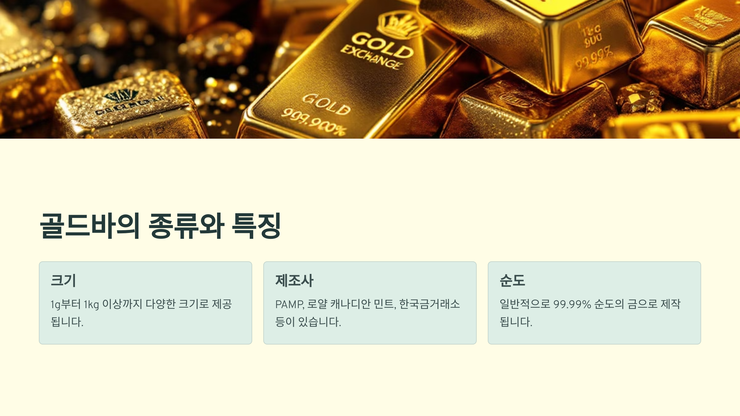 골드바는 일반적으로 순도 99.99%의 금으로 제작돼요. 이를 통해 투자자들은 높은 품질의 금을 보유하게 되고, 금값의 변동에 따라 가치가 달라질 수 있어요. 골드바의 종류와 특징을 잘 이해하면 투자 목적에 맞는 선택을 할 수 있답니다.