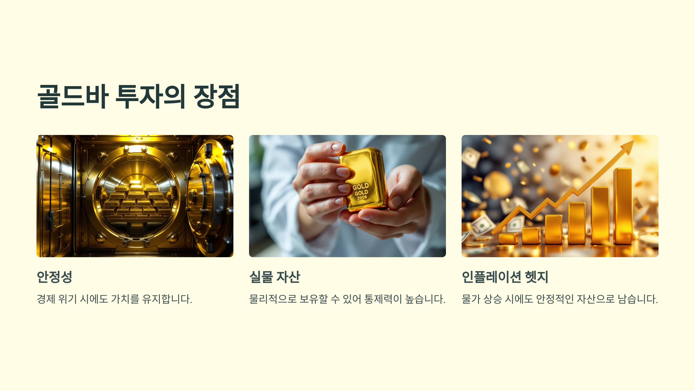 골드바 투자에는 여러 가지 장점이 있어요. 가장 큰 장점은 안정성이에요. 경제 위기나 금융 시스템의 불안정이 발생해도 금은 비교적 가치가 유지되거나 상승하는 경향이 있어요. 이는 금이 전 세계적으로 인정받는 자산이기 때문이에요.