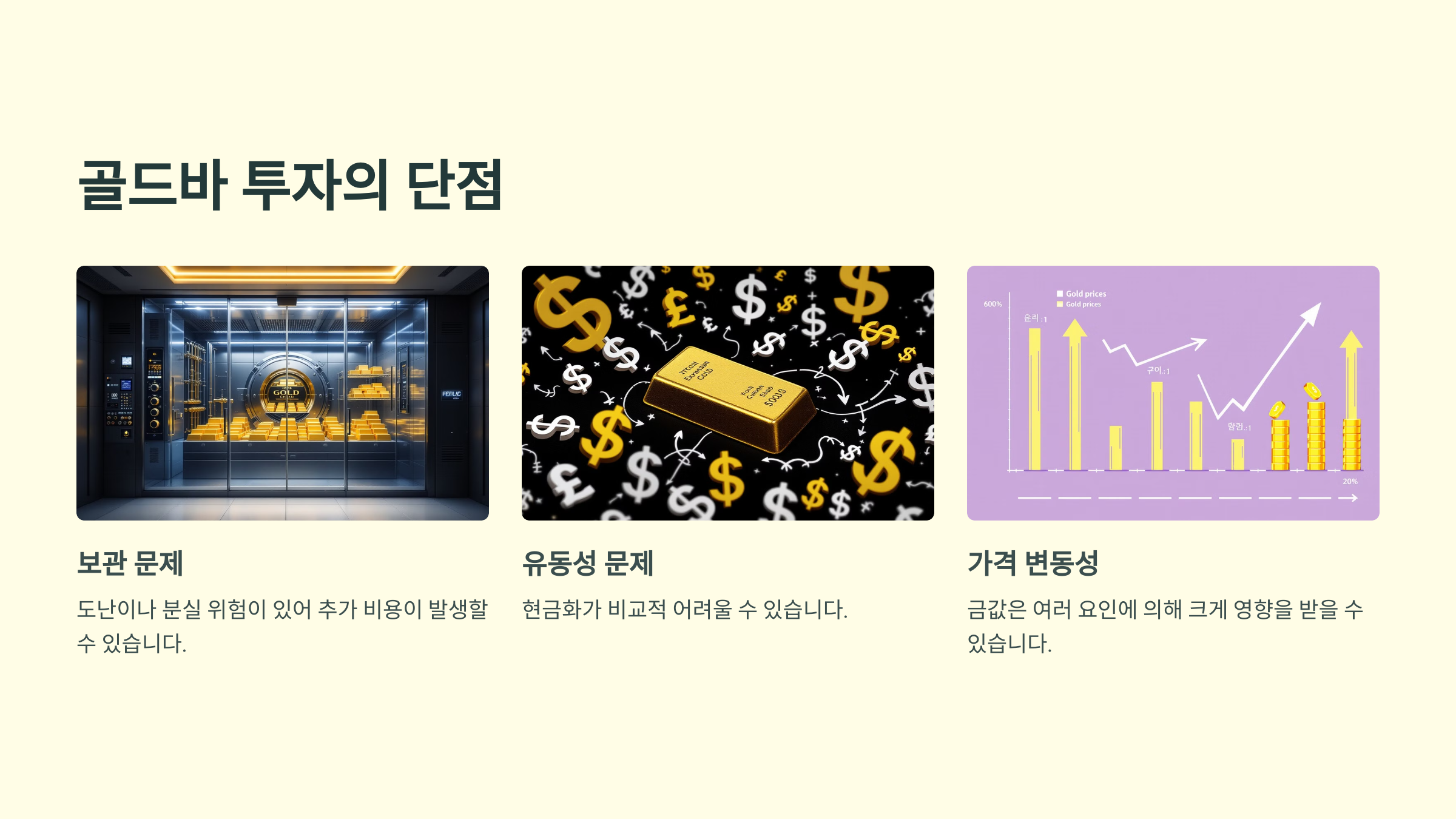 골드바 투자에도 단점이 존재해요. 첫 번째는 보관과 관련된 문제가 있어요. 골드바는 실물 자산이기 때문에 도난이나 분실의 위험이 있어요. 따라서 안전하게 보관하기 위해 은행의 금고 서비스나 개인 금고를 사용하는 것이 중요하답니다. 이러한 추가 비용이 발생할 수 있다는 점은 투자자들이 고려해야 할 부분이에요.