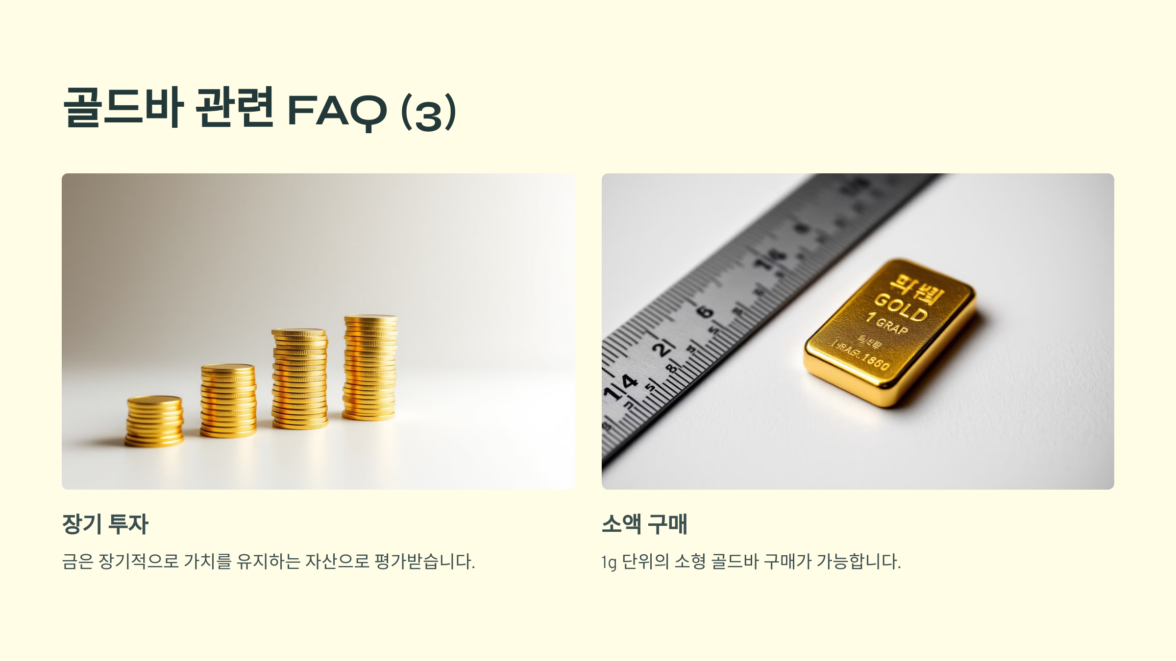 A7. 네, 1g 단위의 소형 골드바를 구매할 수 있어요. 이는 소액 투자자에게 적합한 옵션이에요.