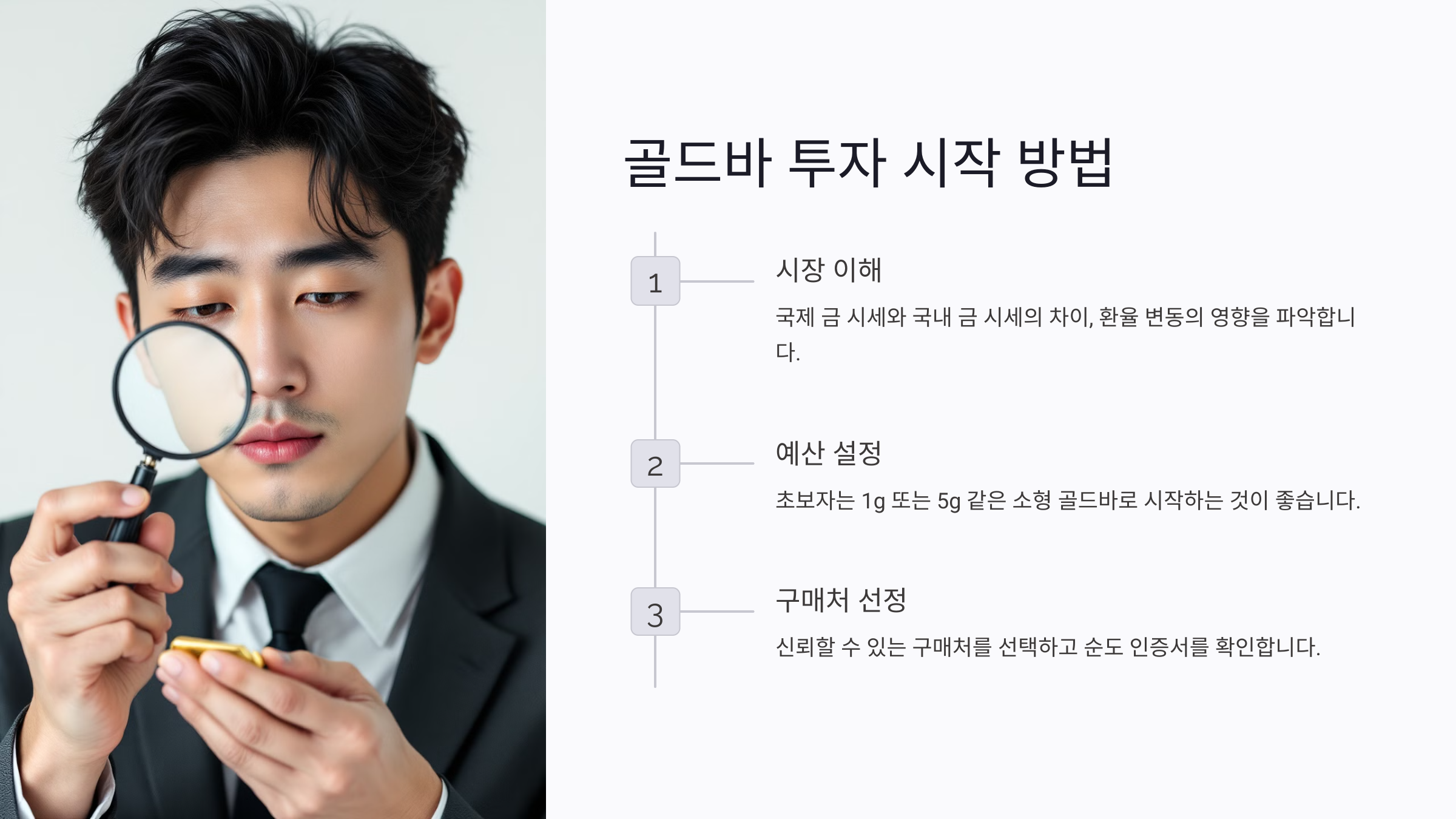 골드바 투자를 시작하려면 먼저 금 시장에 대한 기본적인 이해가 필요해요. 국제 금 시세와 국내 금 시세의 차이를 확인하고, 환율 변동이 금값에 어떤 영향을 미치는지 알아두는 것이 좋아요. 이를 통해 언제 구매하는 것이 유리할지 판단할 수 있답니다.