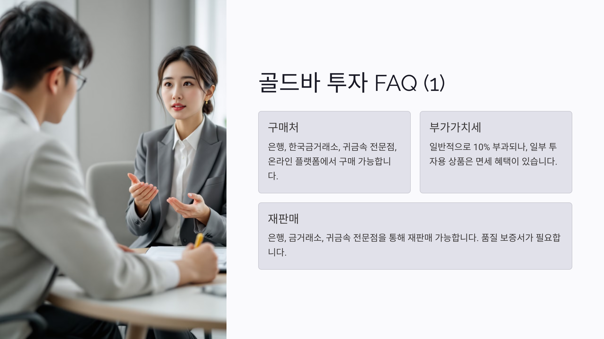 A2. 국내에서 골드바를 구매할 때는 부가가치세 10%가 부과돼요. 다만, 일부 투자용 상품은 면세 혜택을 받을 수 있으니 확인이 필요해요.