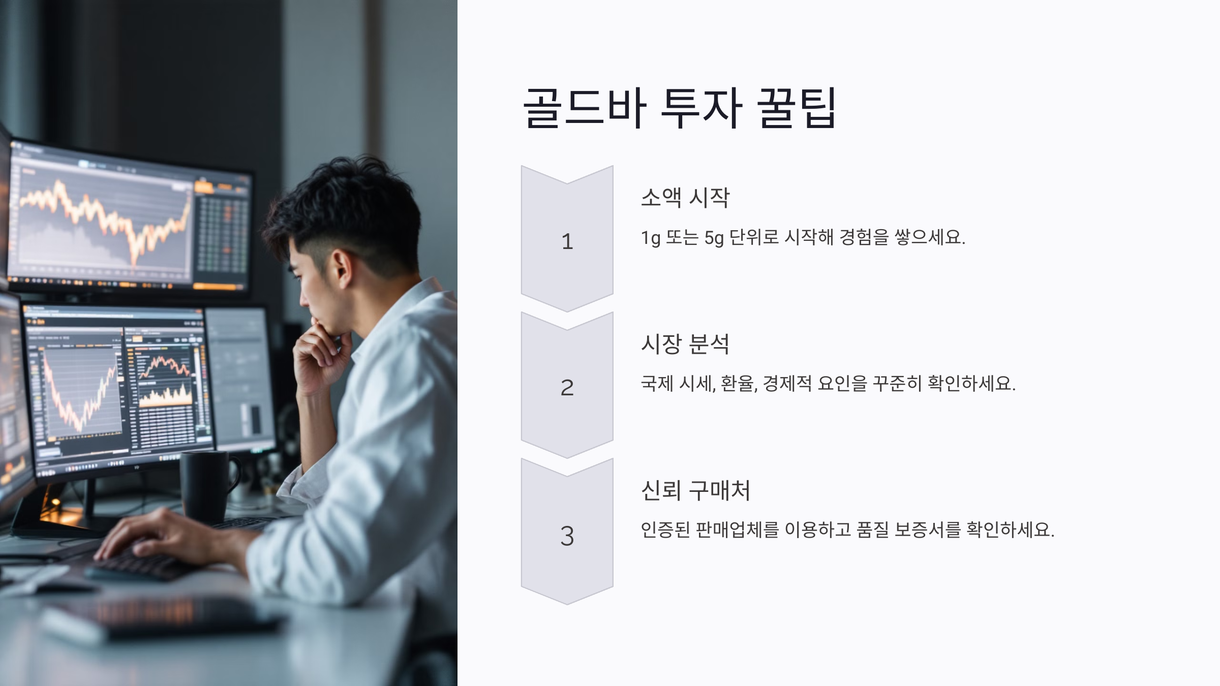 첫 번째 꿀팁은 소액부터 시작하는 거예요. 초보자라면 1g 또는 5g 단위의 골드바를 구매해 시장의 흐름과 투자 경험을 쌓는 것이 좋아요. 금값의 상승과 하락을 직접 체감하면서 감각을 익힐 수 있답니다.