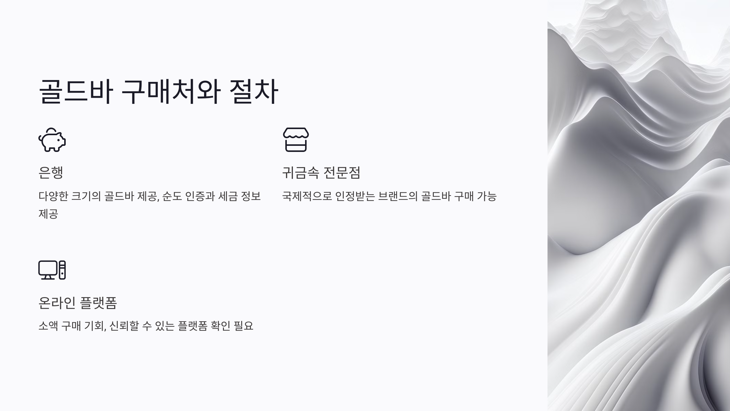 또한, 신뢰할 수 있는 구매처를 선정하는 것이 중요해요. 국내에서는 은행, 한국금거래소, 귀금속 전문점 등에서 골드바를 구매할 수 있어요. 구매 시 순도 인증서와 품질 보증서를 반드시 확인해야 해요. 이는 재판매 시 중요한 역할을 하거든요.